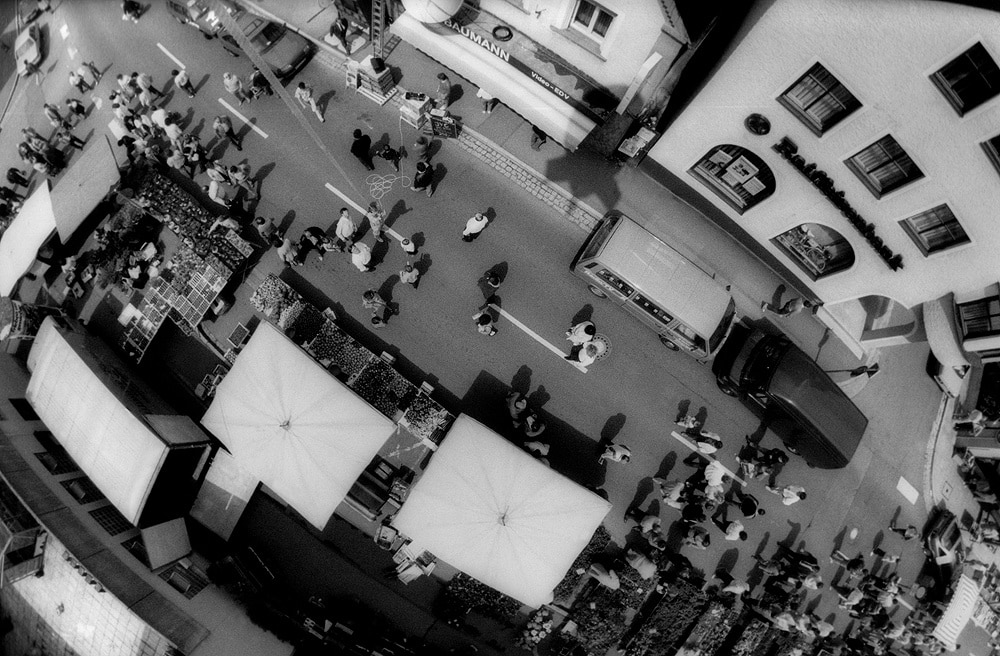 1987 packte er diese Gerätekombination in eine ALDI-Einkaufstüte, die unten aufgeschnitten war, so dass das Objektiv – sicher mit Klebeband fixiert – noch herausschaute. Die Tüte befestigte er an einem zwei Meter großen Fesselballon, startete die Aufnahmeserie per festgestellten Drahtauslöser mit Selbstauslöser und ließ den Ballon langsam nach oben steigen. Die Canon machte eine Aufnahme, der Winder transportierte brav den Film, der Selbstauslöser zählte bis zehn, es machte Klick und so fort, bis der 36er Film durch war. Das ergab vorher nie gesehene Bilder von den Menschenmassen am Pegnitzer Jahrmarkt: analoge Drohnenfotos anno 1987. Genau so hatte sich der Fotograf das Ergebnis vorgestellt, als er aus seinem Bürofenster den Fesselballon vor der Haustür entdeckte.