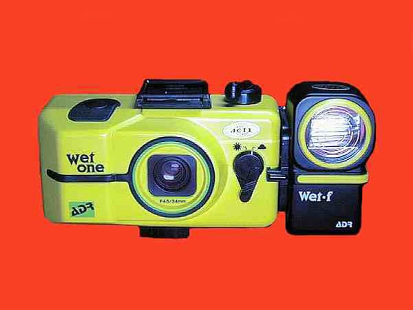 Hersteller bzw. Marke einer „Unterwasserkamera“ (eher Spielzeugkamera) mit zugehörigem Blitzgerät, 1980er Jahre, Japan.