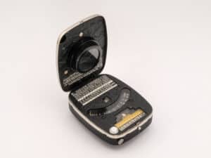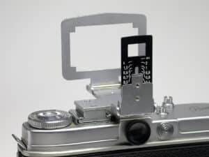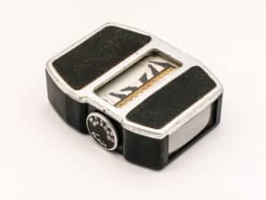 Interessante Sucherkamera (Version von 1954) für den Kleinbildfilm 135 (Aufnahmeformat 24 x 36 mm). Metallgehäuse; die Kappe und die Frontplatte sind aus Messing und verchromt.