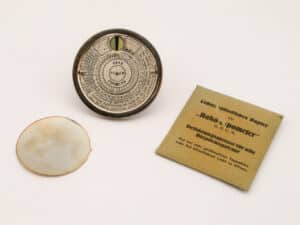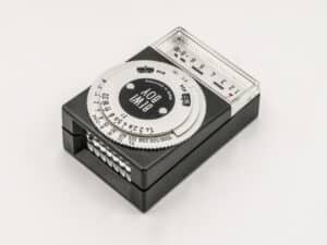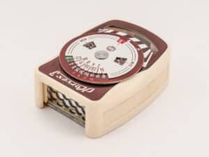 Photochemischer Belichtungsmesser der Firma Heinrich Klapprott, Hamburg, ab 1920. Als Messgröße wird die Zeit verwendet, die Fotopapier unter Lichteinwirkung benötigt, um seinen Farbton dem einer