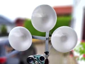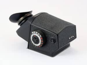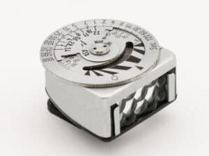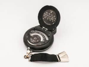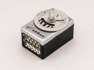 Aufsteck-Belichtungsmesser mit Selen-Fotozelle von Argus Cameras Inc. Ann Arbor, Michigan, USA, Anfang der 1960er Jahre. Das Gerät eines deutschen Herstellers erlaubt die Lichtmessung mittels einer