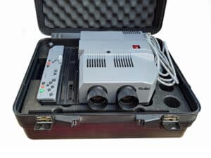Das ist ein handliches (18,5 x 15,5 x 5,5 cm), batteriebetriebenes Gerät (4 x 1,5-Volt AA) zum schnellen Betrachten eines gerade von der Entwicklungsanstalt zurückkommenden