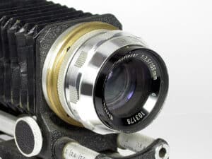Unbezeichnetes antikes Messingobjektiv für Großbildkameras, vermutlich ein Normalobjektiv. Schraubgewinde etwa 65 mm. Steckblende (fehlt beim Museumsexemplar). Schärfeeinstellung mittels Zahntrieb, der noch leicht und geschmeidig zu