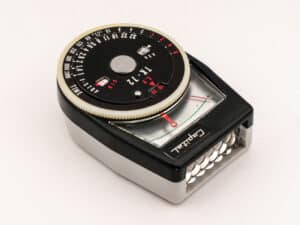 Fotoelektrischer Belichtungsmesser aus Japan im Vertrieb von Copal, Baujahr etwa 1978. CdS-Zelle, Integralmessung (Objekt- und Lichtmessung). Stromversorgung: 1,35 Volt Mercury (PX-13).