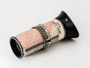 Entwicklungsdose aus Bakelit für den Kleinbildfilm 135, hergestellt in Frankreich. Bestehend aus Dose, Deckel, Spiraleinsatz und Drehstab. Im Museum mit der originalen Gebrauchsanleitung in französischer