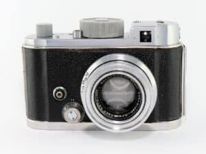 Damals hochmoderne, schwere Messsucherkamera (1957) mit Wechselobjektiven aus Nürnberg für den Kleinbildfilm 135. Mechanischer Zentralverschluss (B, 1 bis 1/300 Sekunde). Objektiv: Enna Werk München Ennit