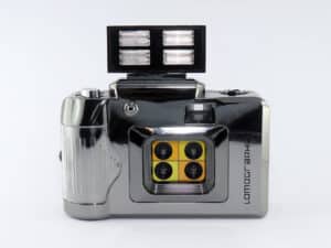 Ein Monstrum von Sofortbildkamera von Polaroid für vier Passbilder, produziert in Japan von 1976 bis 1978. Vier Objektive 1:8/125 mm. Verschluss mit den Zeiten B,
