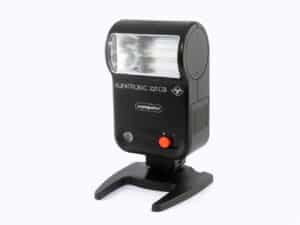 Computerblitzgerät mit Leitzahl 22 bei 21 DIN von Agfa, 1980er Jahre. Abgerundeter, feststehender Reflektor, Kunststoffgehäuse. Computerblende: 5,6 bei 21 DIN, Computerbereich: 0,8 bis 4 Meter,