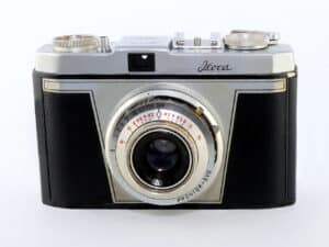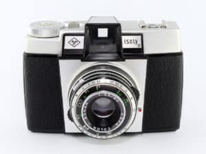 Sucherkamera für den Kleinbildfilm 135 (Aufnahmeformat 24 x 36 mm), hergestellt ab 1960 in Westdeutschland. Objektiv:  ISCO-Göttingen Color-Isconar 1:2,8/45 mm; manuelle Fokussierung nach Meterskala oder