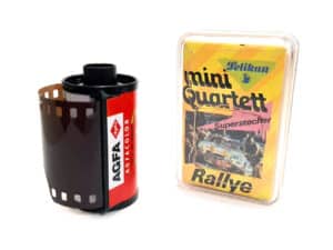 Ein Giveaway der deutschen Fotofirma Agfa aus den 1970er Jahren, das Mini-Quartett Rallye, hergestellt offenbar von Pelikan. Gespielt werden kann – auch – „nach einer