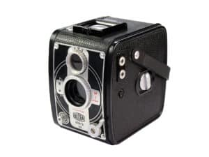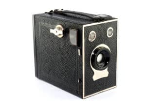 Boxkamera (1952) für den Rollfilm 120/620/B2 (Aufnahmeformat 6 x 6 cm), manuelle Schärfeeinstellung (2 Meter bis unendlich) per Hebel auf der Gehäuseoberseite, Einfachverschluss (B und