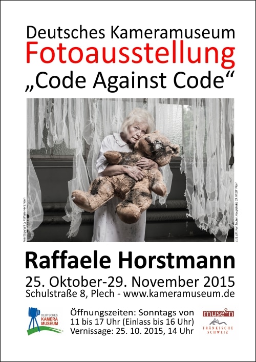 Unmittelbar nach seinem 26. Geburtstag stellte Raffaele Horstmann Kostproben seiner Arbeiten, die niemanden kalt lassen, vom 25. Oktober bis 29. November 2015 in der Galerie des Deutschen Kameramuseums in Plech aus. Die jeweils quadratmetergroßen Drucke seiner „Code Against Code“ getauften Serie hingen erstmalig im kompletten, drei mal zehn Motive umfassenden Konzept. Damit schloss er sein fast fünf Jahre andauerndes Projekt ab und setzte den Schlusspunkt eines turbulenten und erfolgreichen Ausstellungsjahres im Kameramuseum. Museumsleiter Kurt Tauber führte in der Vorbereitungsphase im Herbst 2015 das folgende Interview mit Raffaele Horstmann. Wir dokumentieren das sehr aufschlussreiche Gespräch hier in voller Länge: