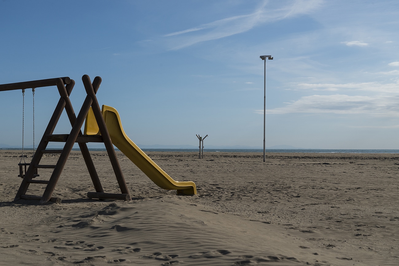 Dort, wo sich im Sommer Tausende von Touristen tummeln, herrscht ab Herbst gähnende Leere und ermöglichen damit Motive mit einem Hauch von „Lost Places“. Die Saison an der Adriaküste geht Mitte September zu Ende. Dann wird Vieles am Strand abgebaut beziehungsweise winterfest verpackt. Die Bilder entstanden also zu einem Zeitpunkt, als an den Stränden gearbeitet wurde, Vieles war bereits nicht mehr vor Ort, in erster Linie Kinderspielanlagen, Duschen, Garderobenhäuschen oder ähnliches.
