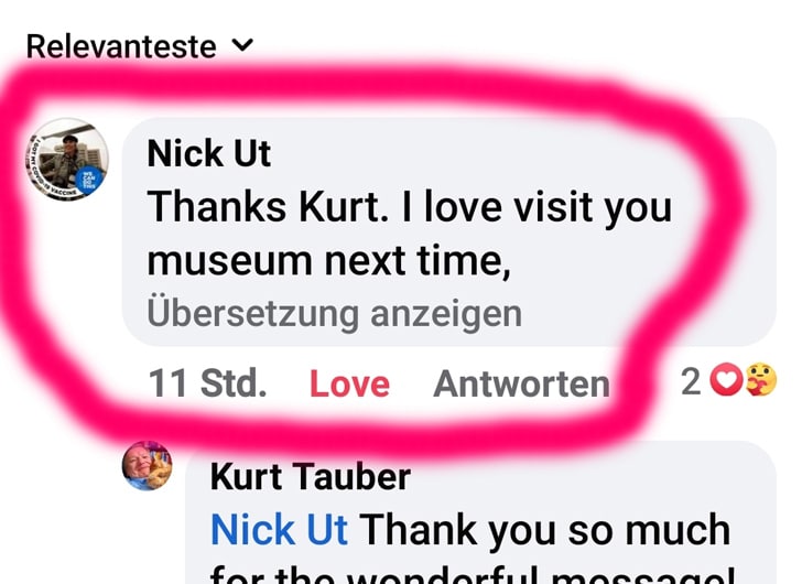 Screenshot der Antwort des weltbekannten Fotoreporters Nick Ut auf Taubers Facebook-Beitrag, wonach er von einem Originalabzug des berühmten Fotos „Napalm Girl“ für das Deutsche Kameramuseum träume. Nick Ut schrieb kurz und bündig: „Thanks Kurt. I love visit you museum next time.“ Was wohl so viel heißt, dass er bei nächster Gelegenheit gerne das Plecher Museum besuchen möchte.