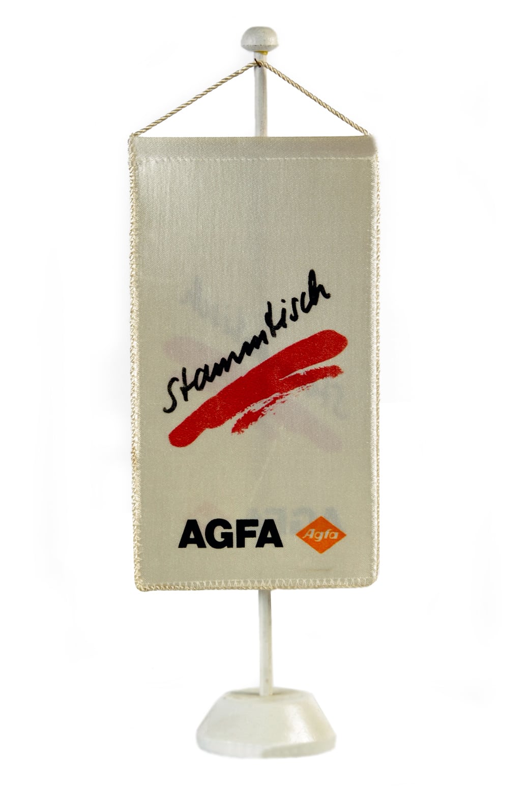 Heute schwer einzuschätzen: War das ein Werbeartikel für Gaststätten, um den Stammtisch zu kennzeichnen? Oder eine Fahne, die bei Agfa-Veranstaltungen verwendet wurde? Oder ein Dekoelement für Messen und Ausstellungen? Jedenfalls ein aufwendig gestaltetes Teil, etwa 20 cm hoch.