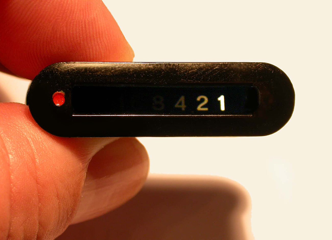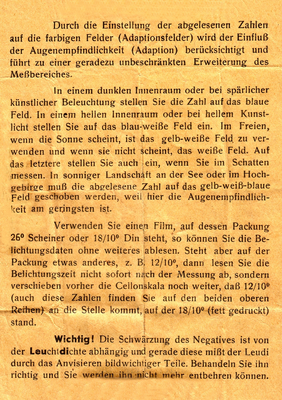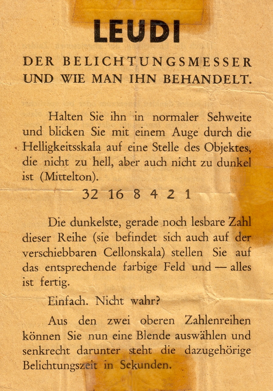Ein Beispiel früher fototechnischer Ingenieurskunst: der optische Belichtungsmesser namens LEUDI (von LEUchtDIchte), vermutlich aus den 1930er Jahren. Die Anleitung beschreibt genau, wie das Gerät funktionieren soll. Man muss den Belichtungsmesser – etwa 3 x 4 cm klein – so in Richtung Objekt halten, dass man anhand der unterschiedlich hellen Zahlen die richtige „Leuchtdichte“ ermittelt, und dann diese Blendenzahl auf der verschiebbaren Skala in einem der Kästchen einstellen (im Bild zum Beispiel die „2“ im weißen Feld). Darunter konnte man dann die richtigen Zeit-/Blendenkombinationen ablesen. Hersteller: Ernst Pless, Wien.