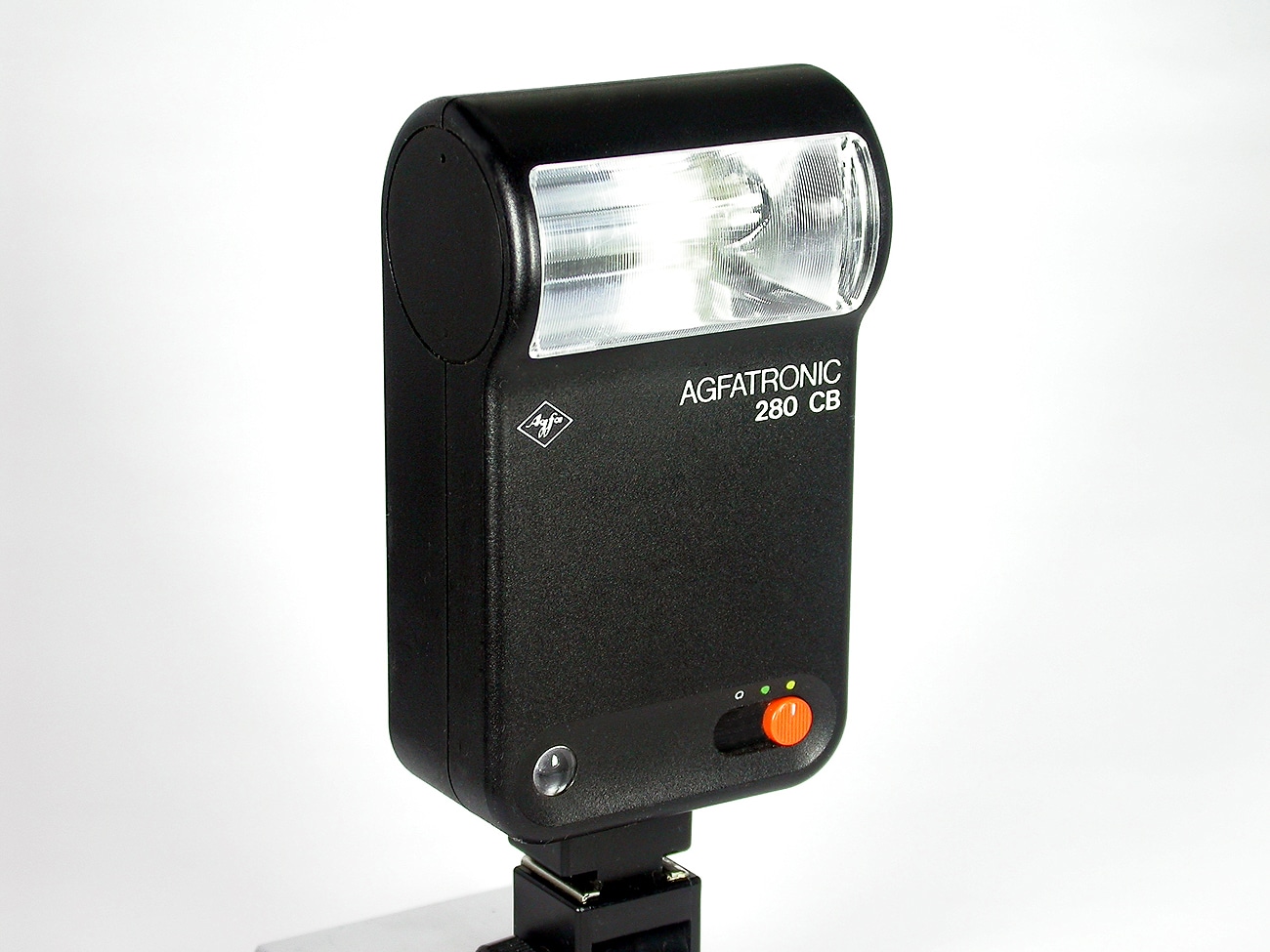 Computerblitzgerät, etwa 1977, Leitzahl 28 bei 21 DIN. Feststehender Reflektor. Mittenkontakt, Kabelanschluss. Stromversorgung: vier Mignonzellen. OVP.