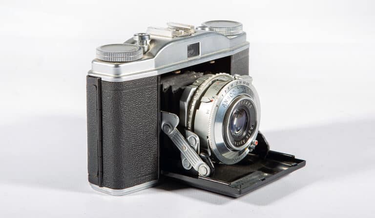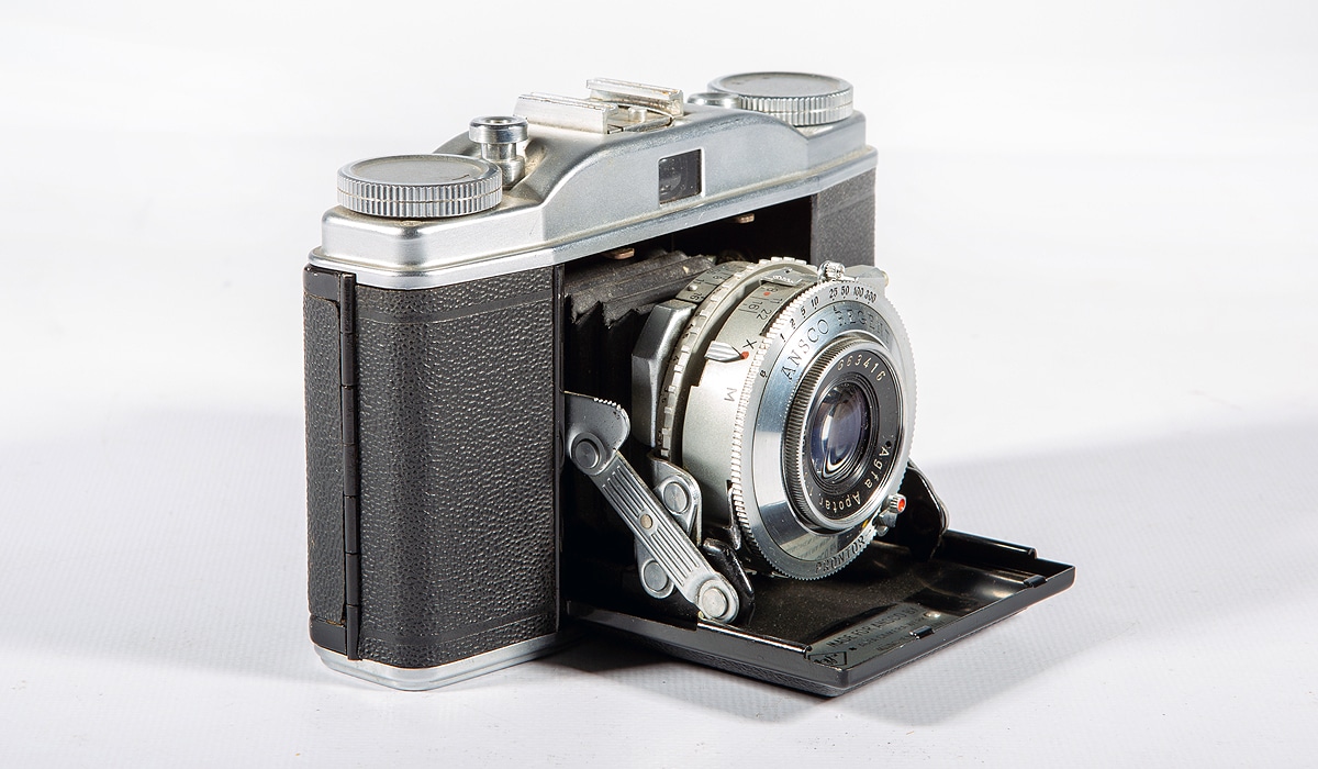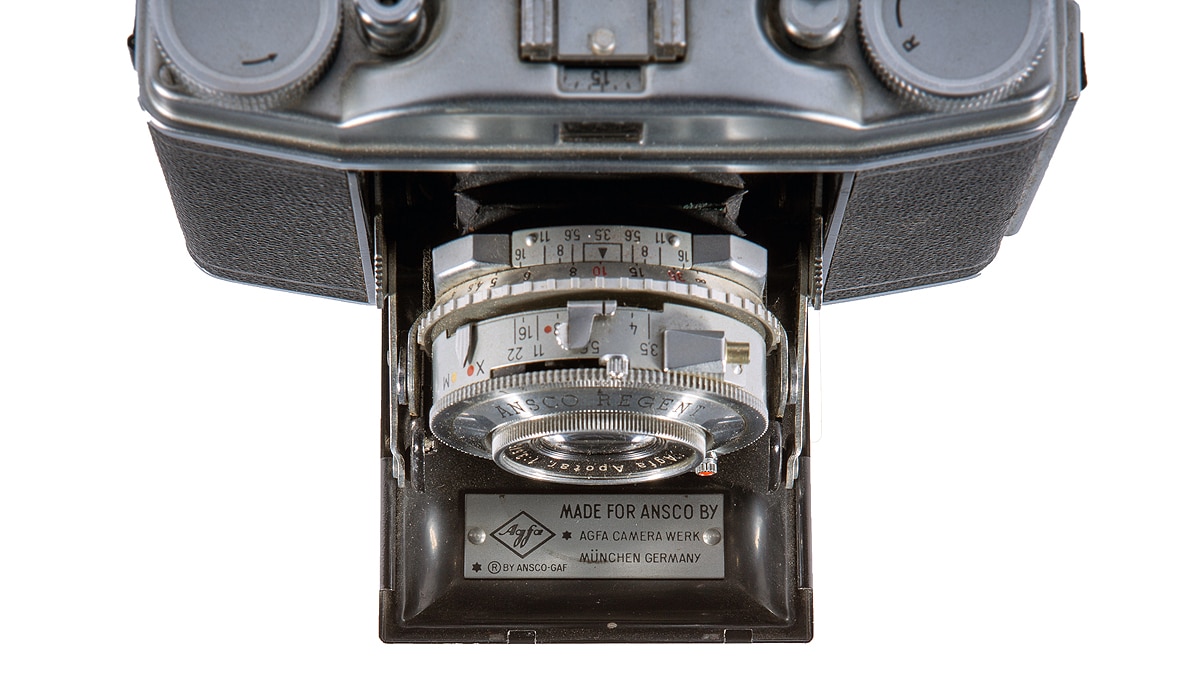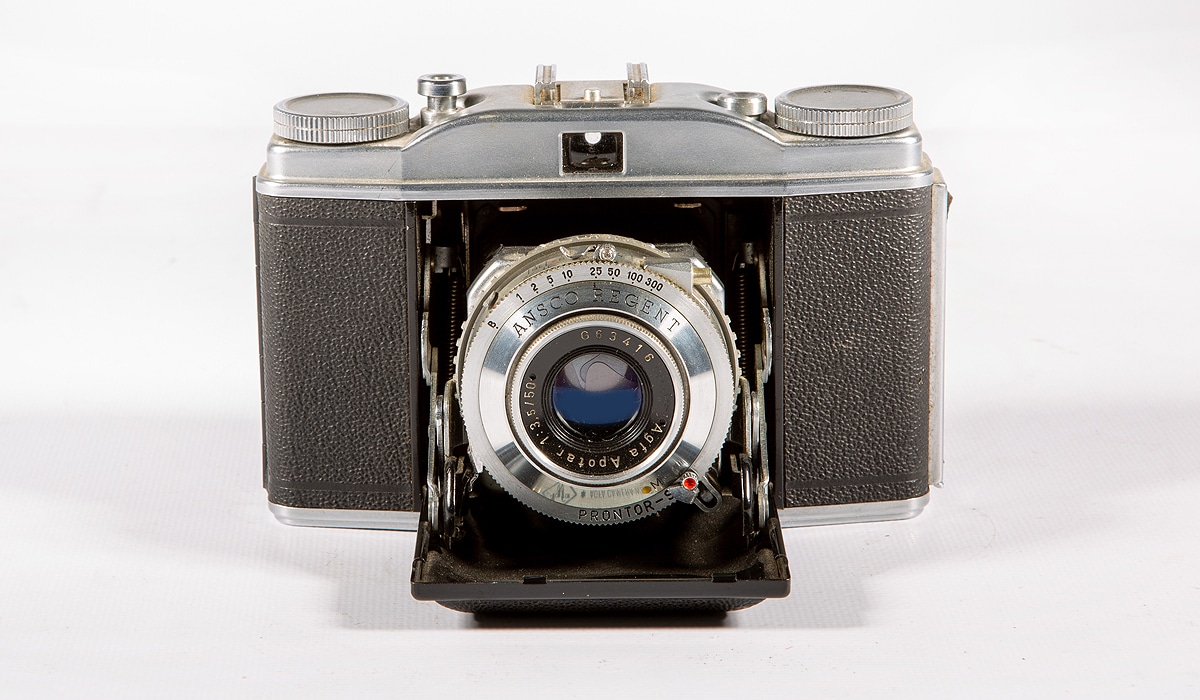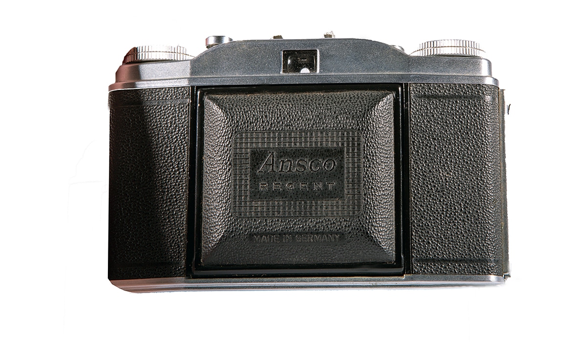 Sucherkamera (1953) mit Klapp-/Spreizenkonstruktion für den Kleinbildfilm 135 (Negativformat 24 x 36 mm), entspricht der Agfa Solinette II. Objektiv: Agfa Apotar 1:3,5/50 mm, Nr. G63416; Newton-/Fernrohrsucher; Verschluss: Prontor-SVS (mit Vorlaufwerk), Zeiten: B, 1 Sekunde bis 1/300 Sekunde. Auf der Vorderseite der Kamera ist das Ansco-Emblem zu sehen, aber bei vielen Exemplaren steht auf einer Plakette, auf die Innenseite der Frontklappe genietet: „Made for Ansco by Agfa Camera Werk München Germany“. Beim Museumsexemplar steht unter dem Schriftzug „Ansco Regent“ deutlich „Made in Germany“.