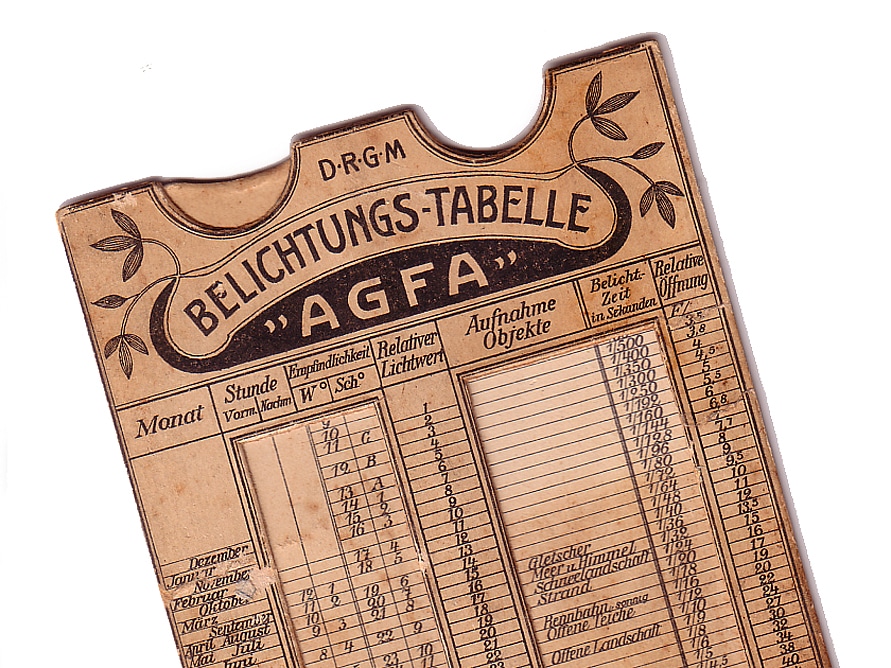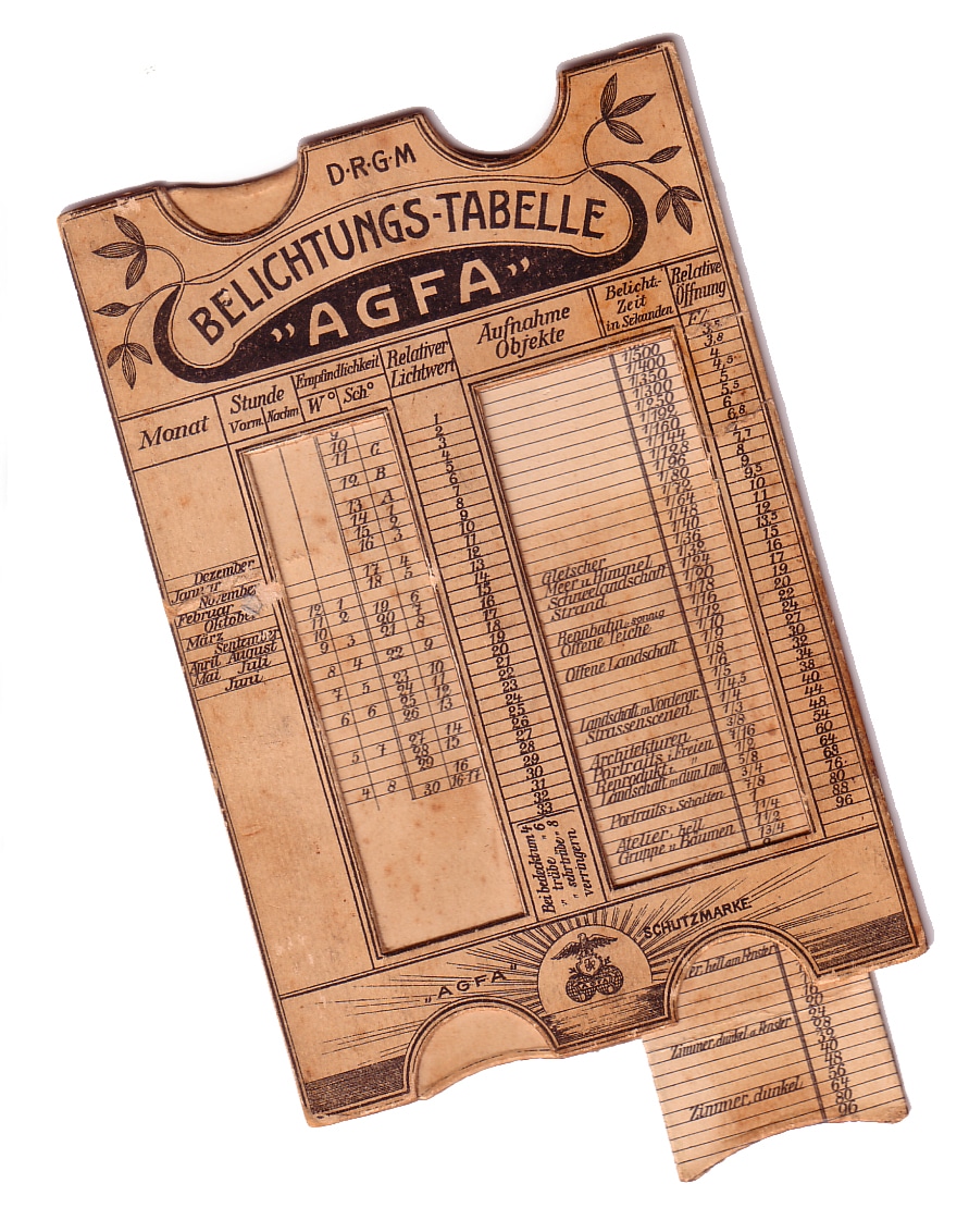Belichtungstabelle von Agfa, gedruckt auf Karton, im Handel schon gut zehn Jahre früher. Laut einer Anzeige vom Februar 1921 wurden „400 000 Stück verkauft“ („Für Tageslicht und Blitzlicht“). Für viele Jahreszeiten und Motive (!) wurden die verschiedenen Belichtungszeiten angegeben. Und zwar noch in den alten Scheiner-Graden (in der Tabelle: „Sch“) und der längst überholten Einheit Warnerke („W“). Der Ergebnis wurde durch zwei Schieber berechnet. Blendenwerte 3,5 bis 96; Lichtwerte 1 bis 33.