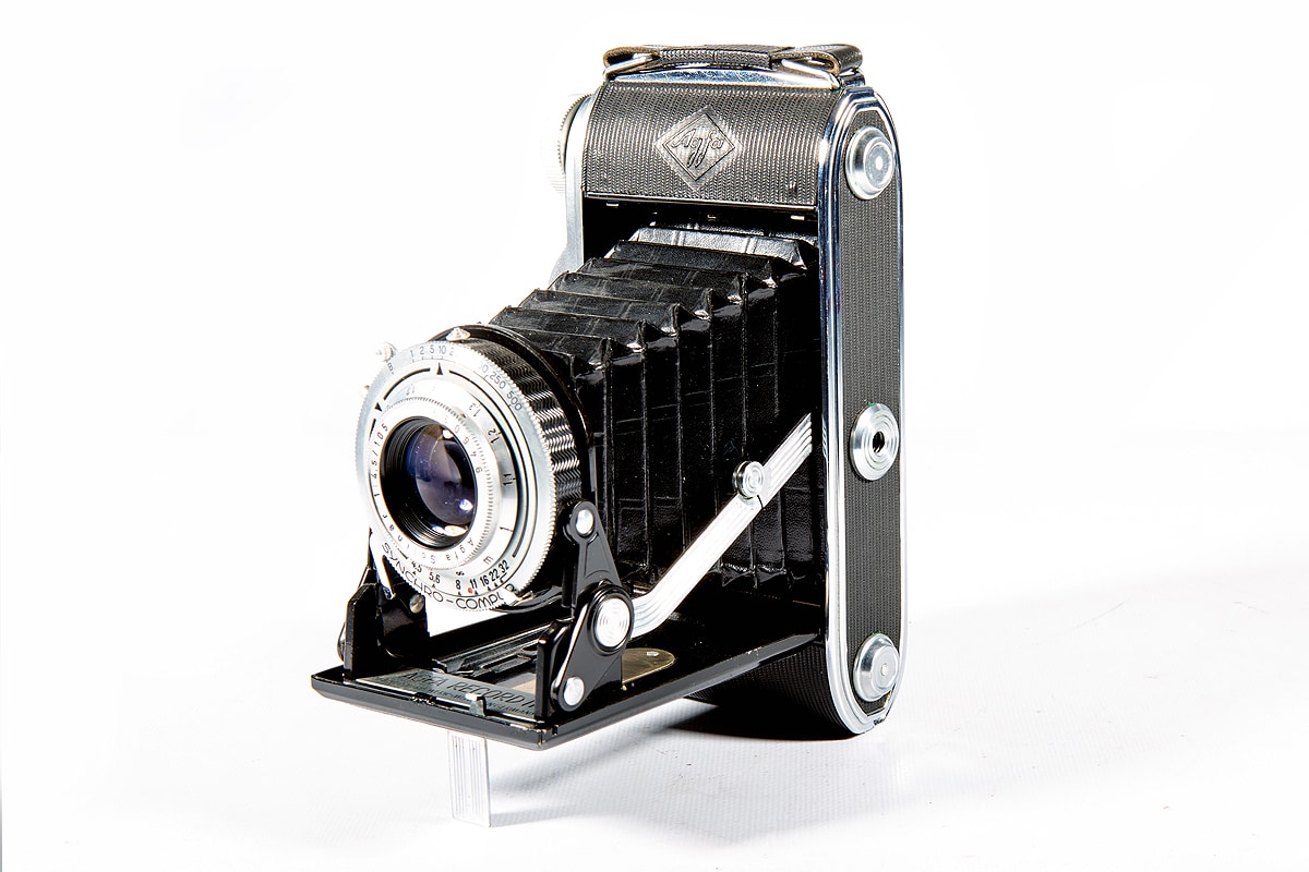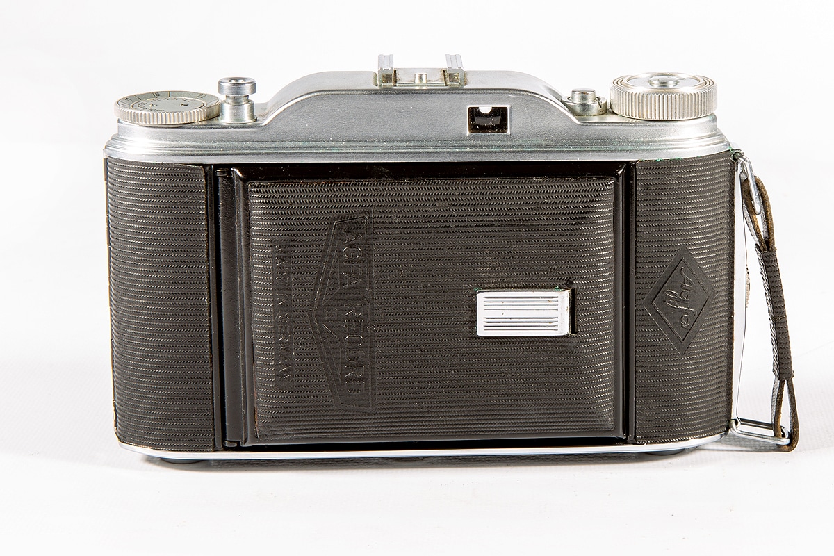 Klapp-/Spreizenkamera, Typ 1452/213, für den Rollfilm 120 (Negativformat 6 x 9 cm). Objektiv: Agfa Solinar 1:4,5/105 mm, Nr. 946039. Newton-/Fernrohrsucher, in die Gehäusekappe eingebaut. Verschluss: Synchro-Compur mit Vorlaufwerk und Blitzsynchronisation über Kabelanschluss; Einstellmöglichkeiten für Birnen- und Elektronenblitz (M, X). Zubehörschuh und Tiefenschärfenrechner in die Gehäusekappe integriert. Die Kombination eines hochwertigen Objektivs und eines ebenso hochwertigen Verschlusses hebt diese Kamera aus der Massenware der 1950er-Jahre heraus.