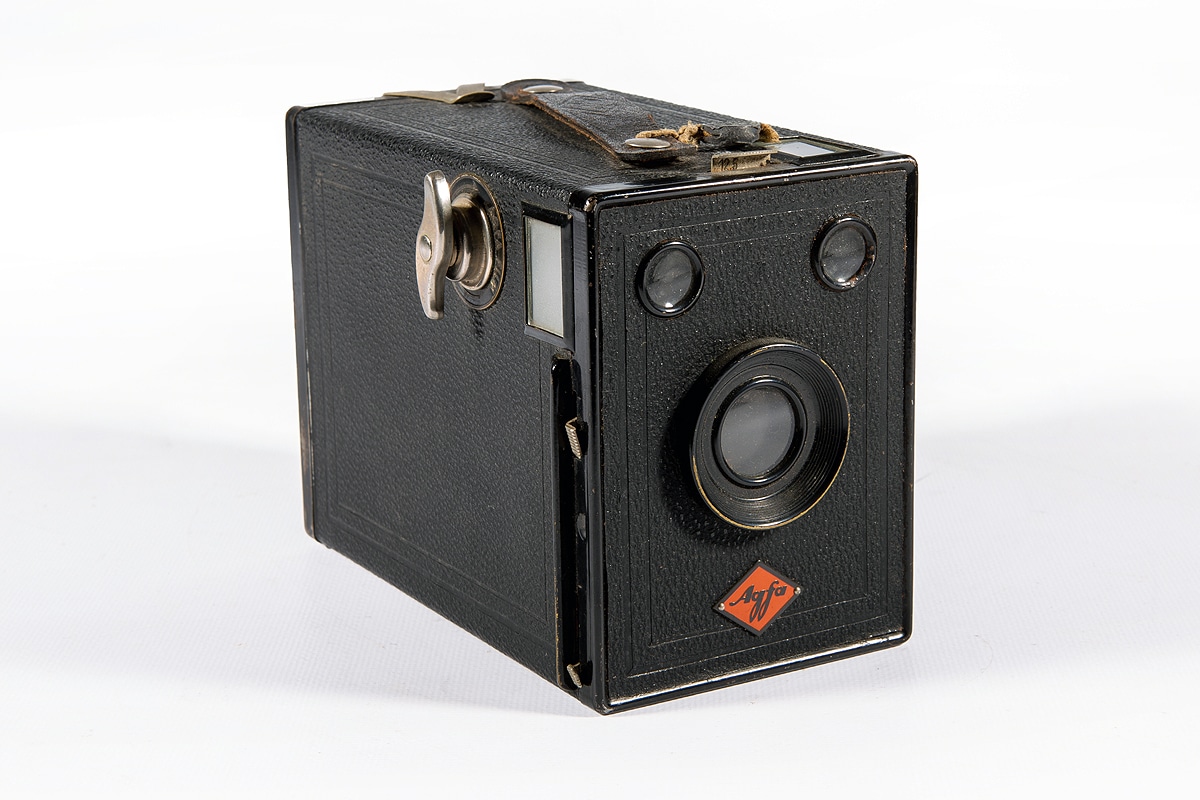 Boxkamera, Typ 54, für den Rollfilm 120 (Negativformat 6 x 9 cm). Objektiv: Meniskus-Linse, 1:12,5/12,5 cm. Zwei weitere Blendeneinstellungen: 16 und 22.