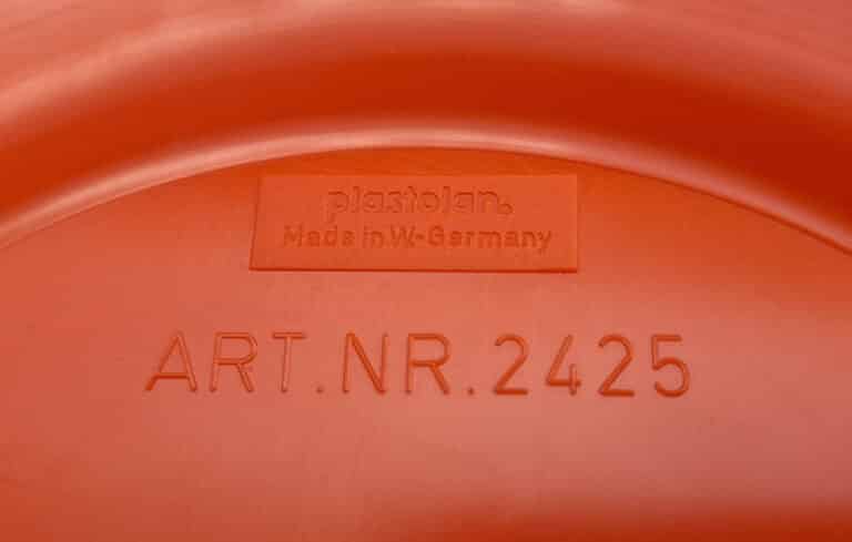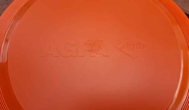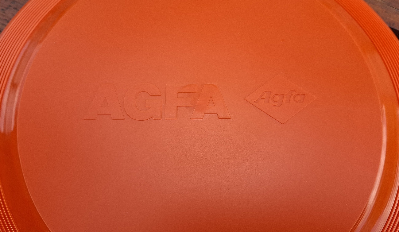Auch so ein Agfa-Werbeartikel der 1970er Jahre: Ein Frisbee, auch Flugscheibe, Segelscheibe oder wie in der DDR Wurfscheibe oder Schwebedeckel genannt, ist ein meist aus Kunststoff gefertigtes, scheibenförmiges Sport- und Freizeitgerät. Es wird durch aerodynamischen Auftrieb und Kreiselbewegung in der Luft gehalten. Normalerweise hat die Wettkampfscheibe 125 Gramm. Das Agfa-Frisbee wiegt nur 90 Gramm und misst etwa 22 cm im Durchmesser. Die Höhe beträgt etwa 3 cm. Produziert wurde das Sportgerät vom Werbeartikelhersteller Plastolan in Lippstadt..