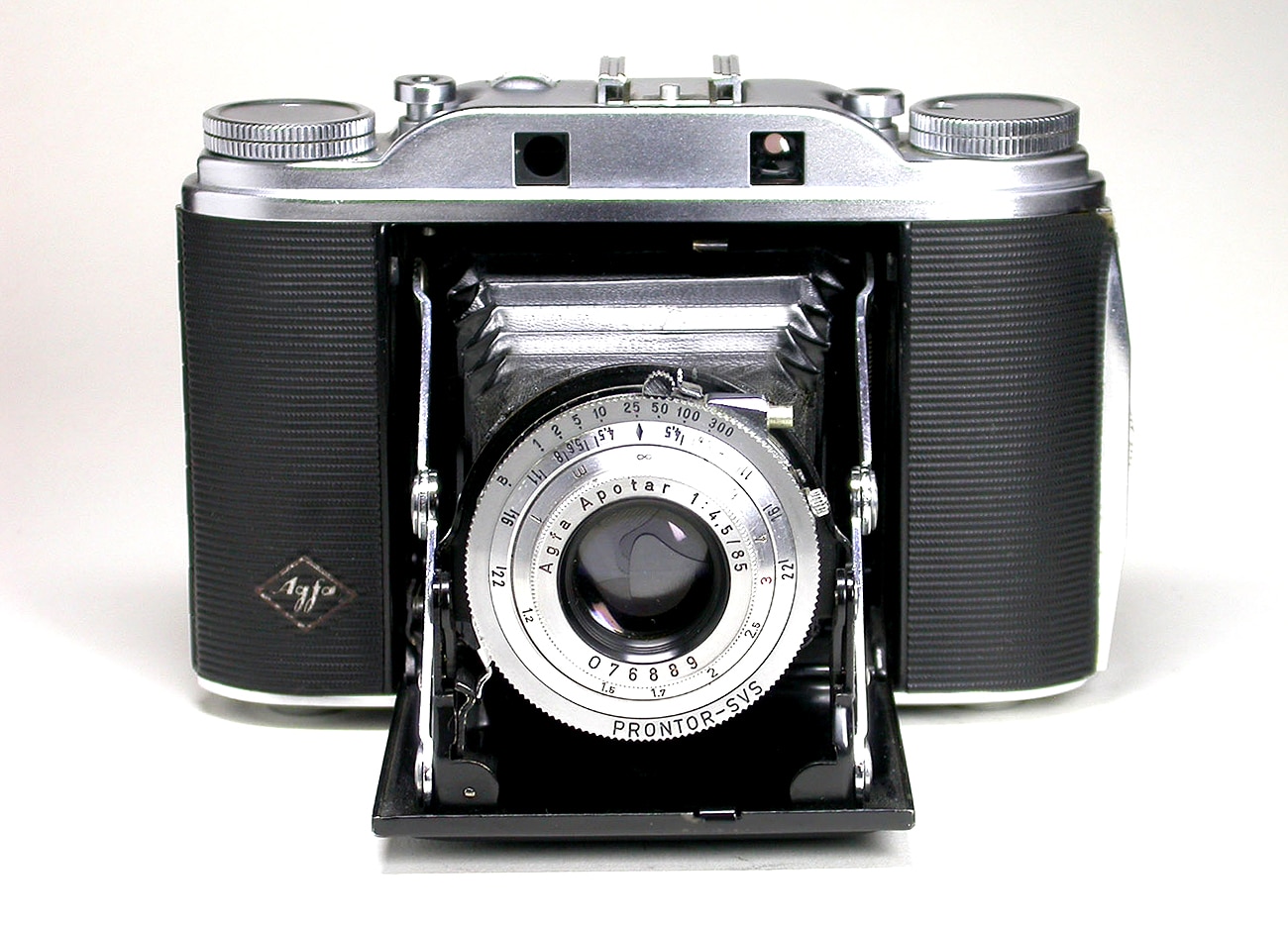 Vom Typ Isolette/Jsolette gibt es über 120 bekannte Variationen: Hier eine Isolette III, gebaut von 1954 bis 1959. Klapp-/Spreizenkamera für den Rollfilm 120 (Negativformat 6 x 6 cm). Objektiv: Agfa Apotar 1:4,5/85 mm, Nr. 076889; Newton-/Fernrohrsucher als Messsucher mit ungekuppeltem Entfernungsmesser. Verschluss: Prontor-SVS (Alfred Gauthier, Calmbach) mit Zeiten bis 1/300 Sekunde. Kunststoffbalgen; Doppelbelichtungssperre; Tiefenschärfenrechner.