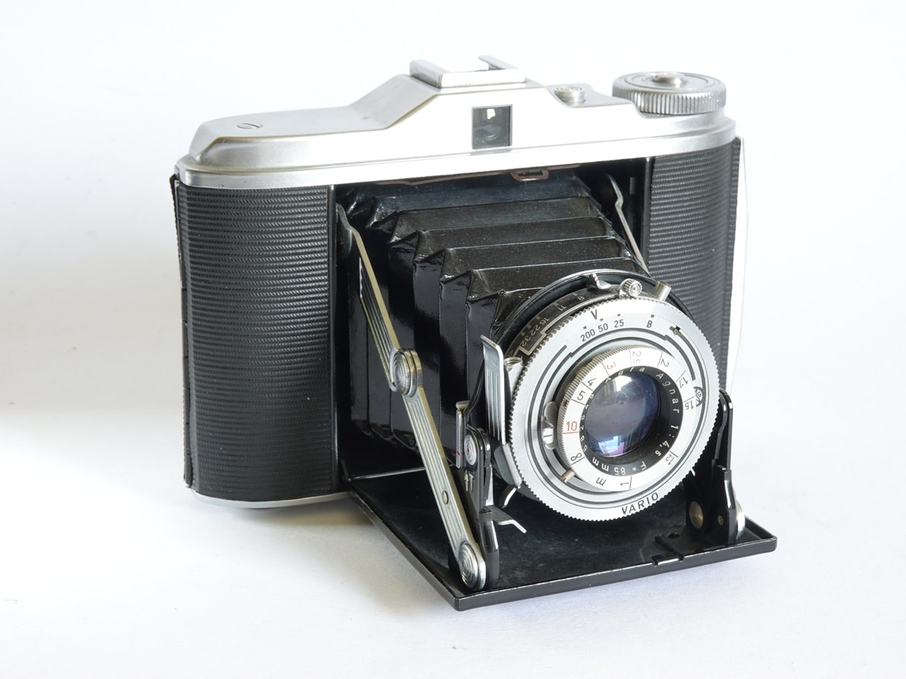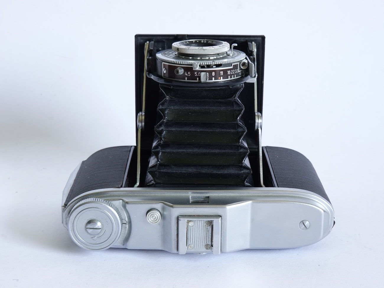 Sucherkamera (1949 bis 1952) für den Rollfilm 120/620/B2 (Aufnahmeformat 6 x 6 cm), Klapp-/Springkonstruktion. Objektiv: Agnar 1:4,5/85 mm, Seriennummer 582649, Aufsteckfilter 30 mm; manuelle Schärfeeinstellung. Fernrohrsucher. Mechanischer Zentralverschluss Vario (B, 1/25 bis 1/200 Sekunde; Einstellung „T“ durch zusätzlichen Hebel möglich); manuelle Belichtungssteuerung. Der Zubehörschuh ist mittig auf dem Sucher angebracht.