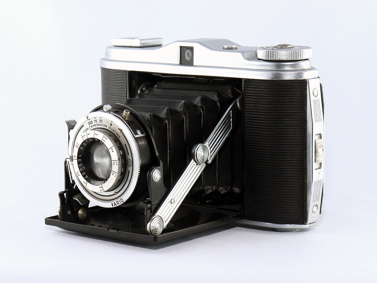 Sucherkamera (1949 bis 1952) für den Rollfilm 120/620/B2 (Aufnahmeformat 6 x 6 cm), Klapp-/Springkonstruktion, manuelle Schärfeeinstellung, mechanischer Zentralverschluss Vario bis 1/200 Sekunde, manuelle Belichtungssteuerung, Zubehörschuh. Objektiv: Agnar 1:4,5/85 mm, Seriennummer 467534, Aufsteckfilter 30 mm.