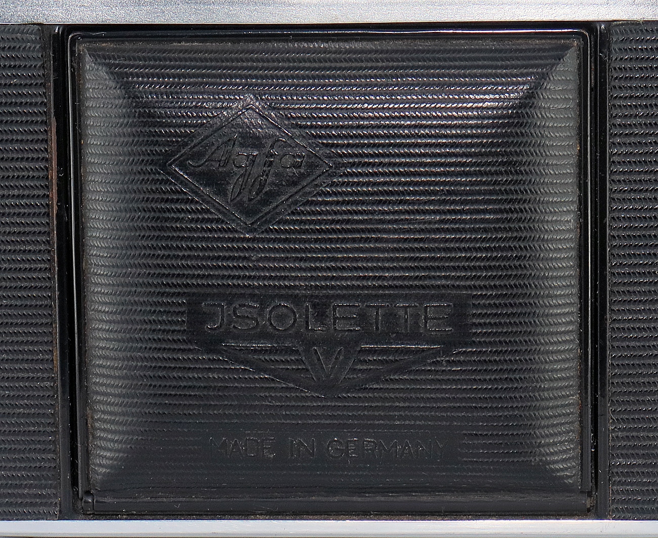 Die frühen Agfa-Isolettes hatten noch die Beschriftung mit „J“ statt „I“ am Anfang, also „Jsolette V“. In der Exportversion hieß die Isolette V „Ventura 66“.