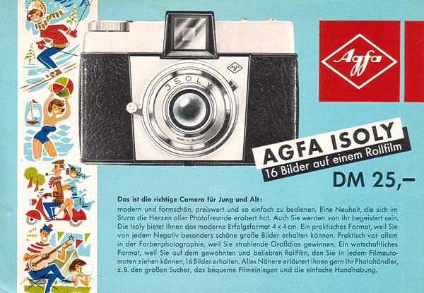 Sehr einfache Sucherkamera für den Rollfilm 120 (Negativformat 4 x 4 cm), gebaut ab 1961. Objektiv: Meniskus 1:11/55 mm, mit zwei Entfernungseinstellungen. Newton-/Fernrohrsucher. Einfachverschluss. Manuelle Belichtungssteuerung (Blende 11 oder 16). Blitzschuh mit Mittenkontakt. Bedienungsanleitung für die Agfa Isoly (kostenloser Download).