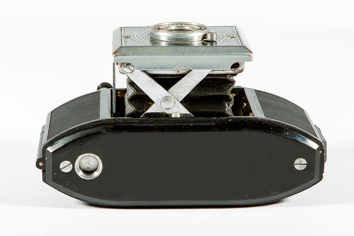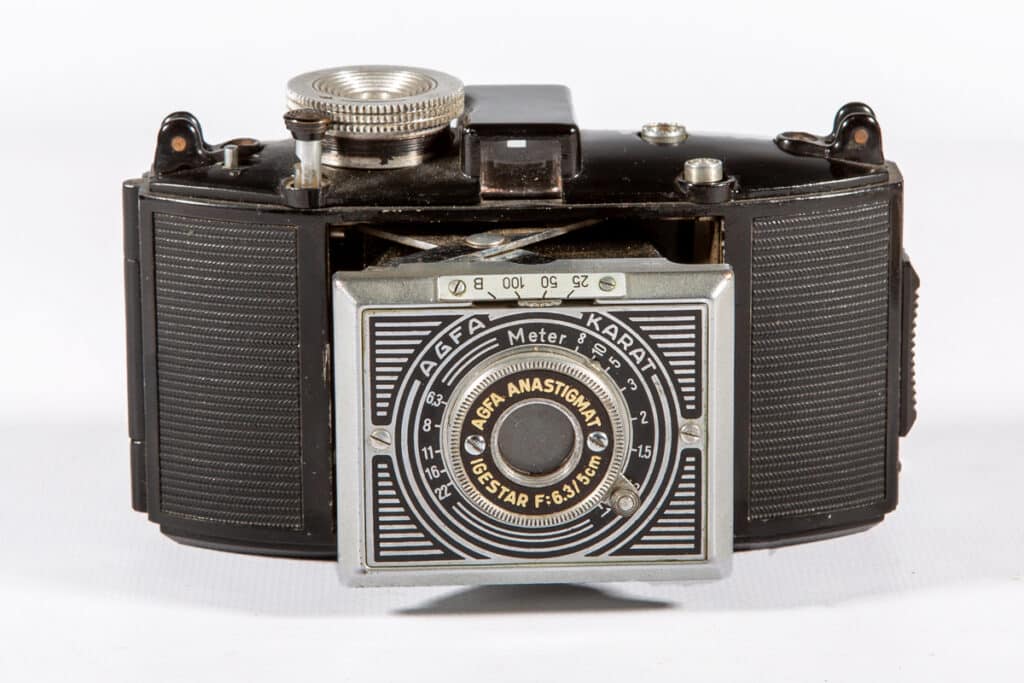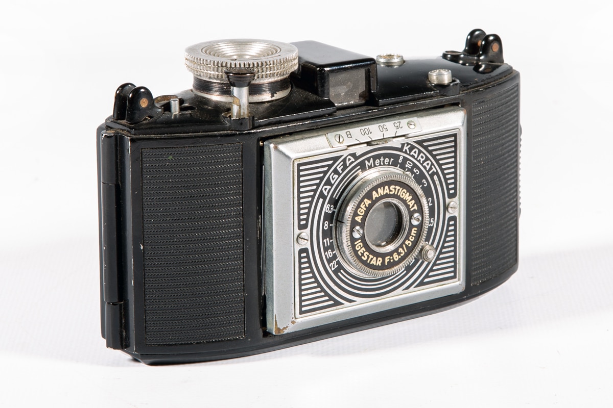 Sucherkamera für den Kleinbildfilm 135 (Aufnahmeformat 24 x 36 mm) mit Spreizenkonstruktion, Typ 2010. Objektiv: Agfa Anastigmat Igestar 1:6,3/5 cm, Newton-/Fernrohrsucher, mechanischer Zentralverschluss (25/50/100/B). Manuelle Belichtungssteuerung; ein Hebel („T“) an der Gehäusekappe ermöglicht in Kombination mit der Verschlusseinstellung „B“ Zeitaufnahmen. Gehäusekappe aus Trolit (ähnlich Bakelit). Als erste Kleinbildkamera bot die Karat 1937 das einfache Filmeinlegen: Die Spezialpatrone hatte 12 Aufnahmen. Der Film lief von Patrone zu Patrone und musste daher nicht zurückgespult werden. Das einfachste Modell dieser „Volkskamera“ mit der hier gezeigten 1:6,3-Optik kostete 35 RM. Varianten mit 1:4,5- und 1:3,5-Objektiv folgten. Nur die Karat 6,3 von 1937 hatte die Art-déco-Frontplatte.
