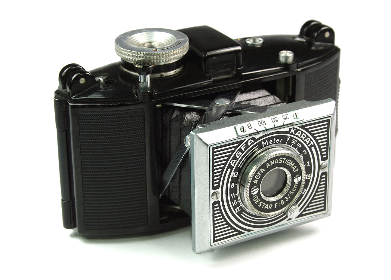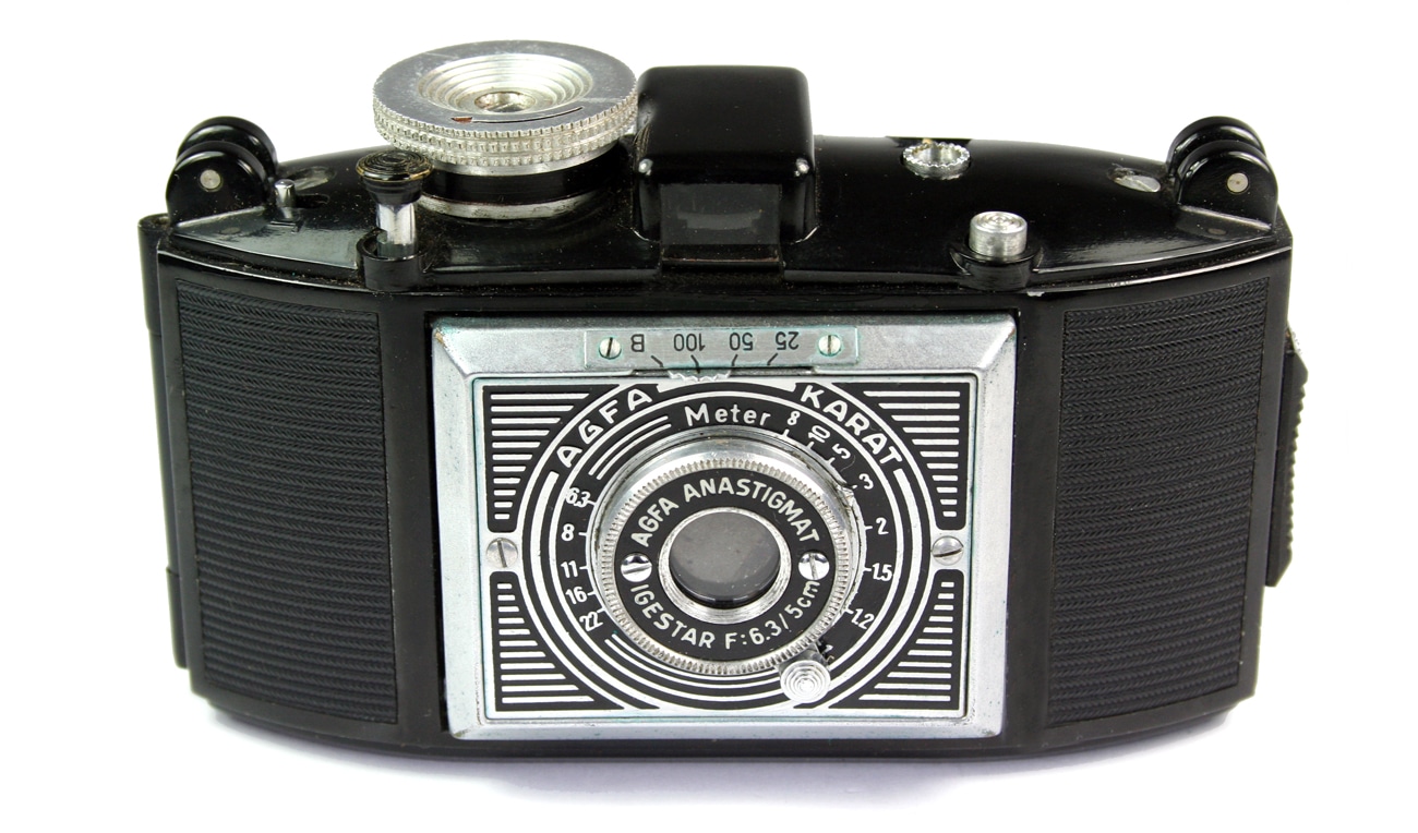 Sucherkamera für den Kleinbildfilm 135 (Aufnahmeformat 24 x 36 mm) mit Spreizenkonstruktion, Typ 2010. Objektiv: Agfa Anastigmat Igestar 1:6,3/5 cm, Newton-/Fernrohrsucher, mechanischer Zentralverschluss (25/50/100/B). Manuelle Belichtungssteuerung; ein Hebel („T“) an der Gehäusekappe ermöglicht in Kombination mit der Verschlusseinstellung „B“ Zeitaufnahmen. Gehäusekappe aus Trolit (ähnlich Bakelit). Als erste Kleinbildkamera bot die Karat 1937 das einfache Filmeinlegen: Die Spezialpatrone hatte 12 Aufnahmen. Der Film lief von Patrone zu Patrone und musste daher nicht zurückgespult werden. Das einfachste Modell dieser „Volkskamera“ mit der hier gezeigten 1:6,3-Optik kostete 35 RM. Varianten mit 1:4,5- und 1:3,5-Objektiv folgten. Nur die Karat 6,3 von 1937 hatte die Art-déco-Frontplatte.