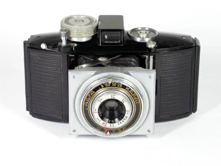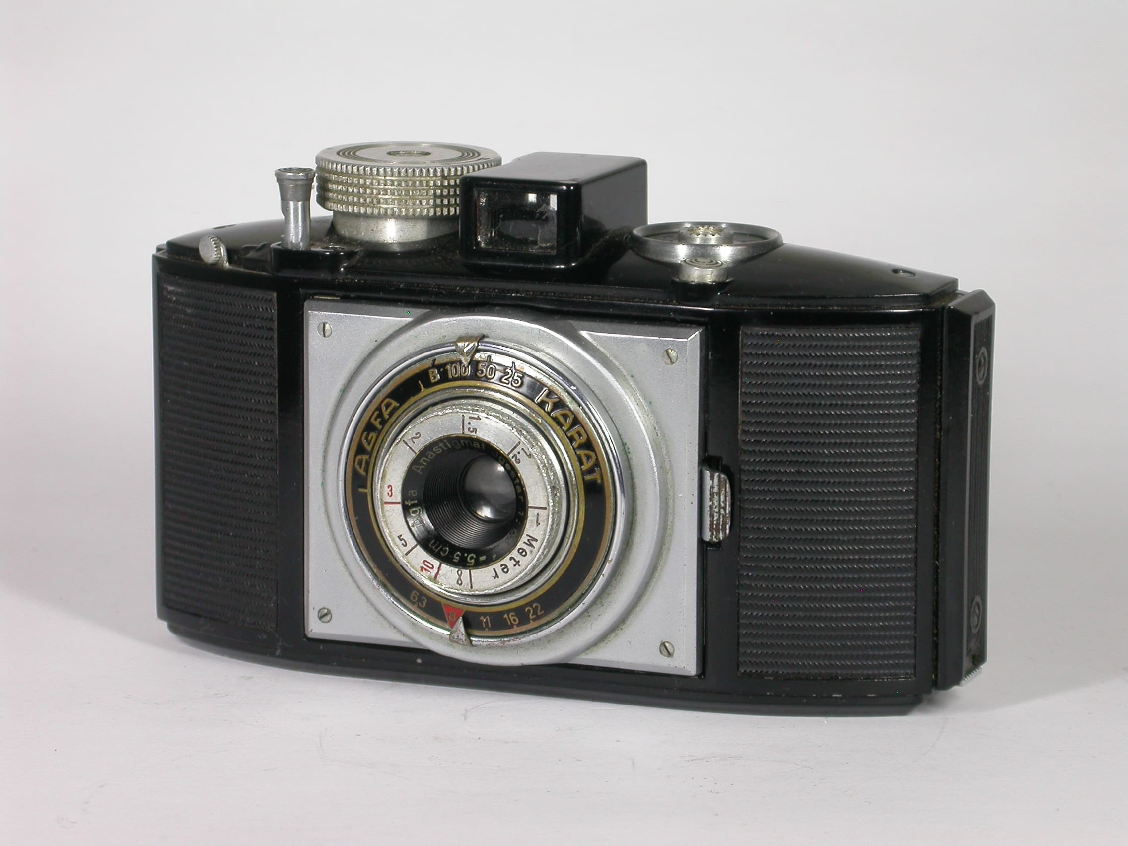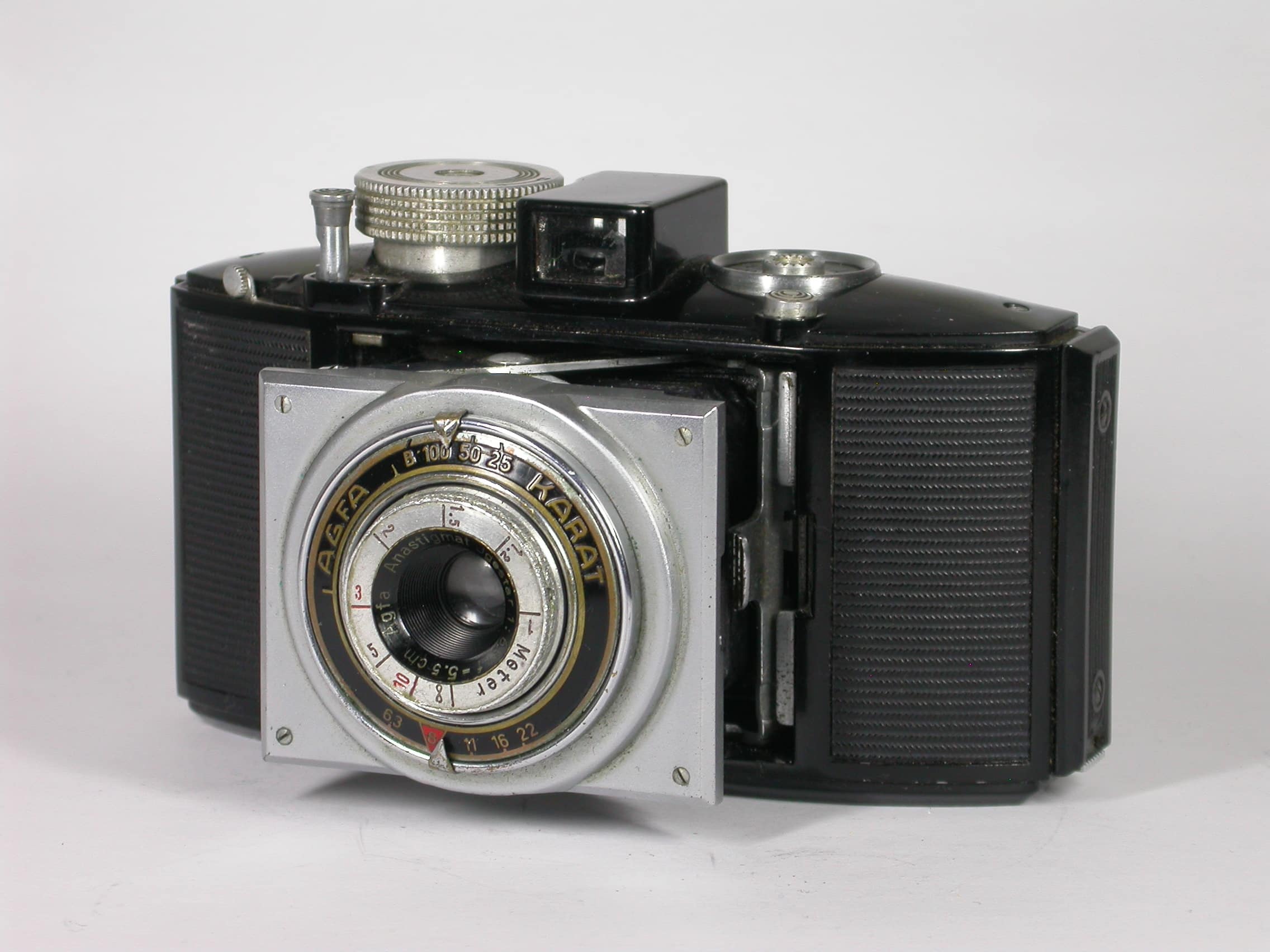 Als erste Kleinbildkamera (24 x 36 mm) bot die Agfa Karat 1937 das einfache Einlegen des KB-Films. Die Spezialpatrone hatte 12 Aufnahmen. Der Film lief von Patrone zu Patrone und musste daher nicht zurückgespult werden. Das einfachste Modell dieser „Volkskamera“ mit 1:6,3-Optik kostete RM 35. Varianten mit Lichtstärke 1:4,5 und 1:3,5 folgten. Nur die Karat 6,3 von 1937 hatte eine Jugendstil-Frontplatte. Die Agfa Karat 6,3 von 1939 (Bild) ist technisch eine Karat 1937, nur ohne die Jugendstilplatte. Weitere Daten: Spreizenkonstruktion, manuelle Scharfeinstellung, mechanischer Zentralverschluss (B, 1/25, 1/50 und 1/100 Sekunde). Manuelle Belichtungssteuerung. Objektiv: Anastigmat Igestar 1:6,3/50 mm.