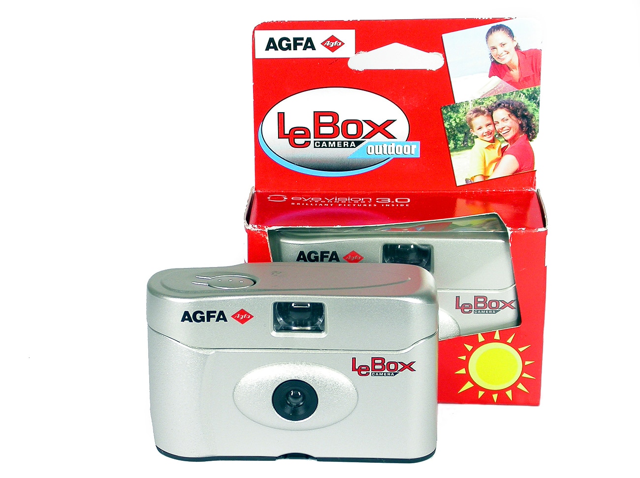 Einwegkamera von Agfa mit ansprechendem silberfarbenem Gehäuse aus Plastik, mit Originalverpackung. Film für Papierbilder mit 27 Negativen (Kleinbildfilm 135). Aufdruck: „Film made in Germany/Camera made in China“. Hergestellt vermutlich etwa 2004 („Zu entwickeln bis 6/2006“).