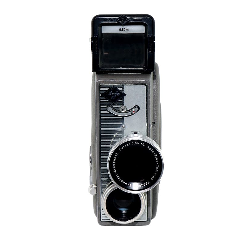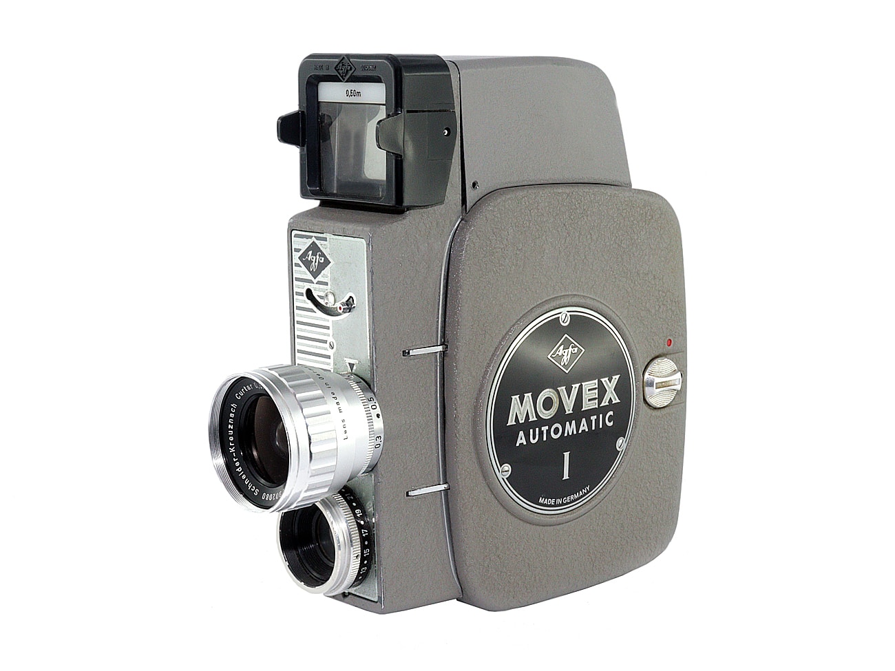 Schwere Doppel-8-Filmkamera aus Deutschland: Metallgehäuse, Federwerksantrieb, Belichtungsautomatik mit gekuppeltem CdS-Belichtungsmesser. Stromversorgung: 2 x Mallory Knopfzelle RM-625 mit je 1,34 Volt. Objektiv: Agfa Movestar 1:1:1,9/12,5 mm; hier mit Weitwinkelvorsatz Schneider-Kreuznach Curtar 0,5 x „für Agfa-Kine-Cameras“ (Seriennummer: 7902080) mit passendem Suchervorsatz (im Bild oben).