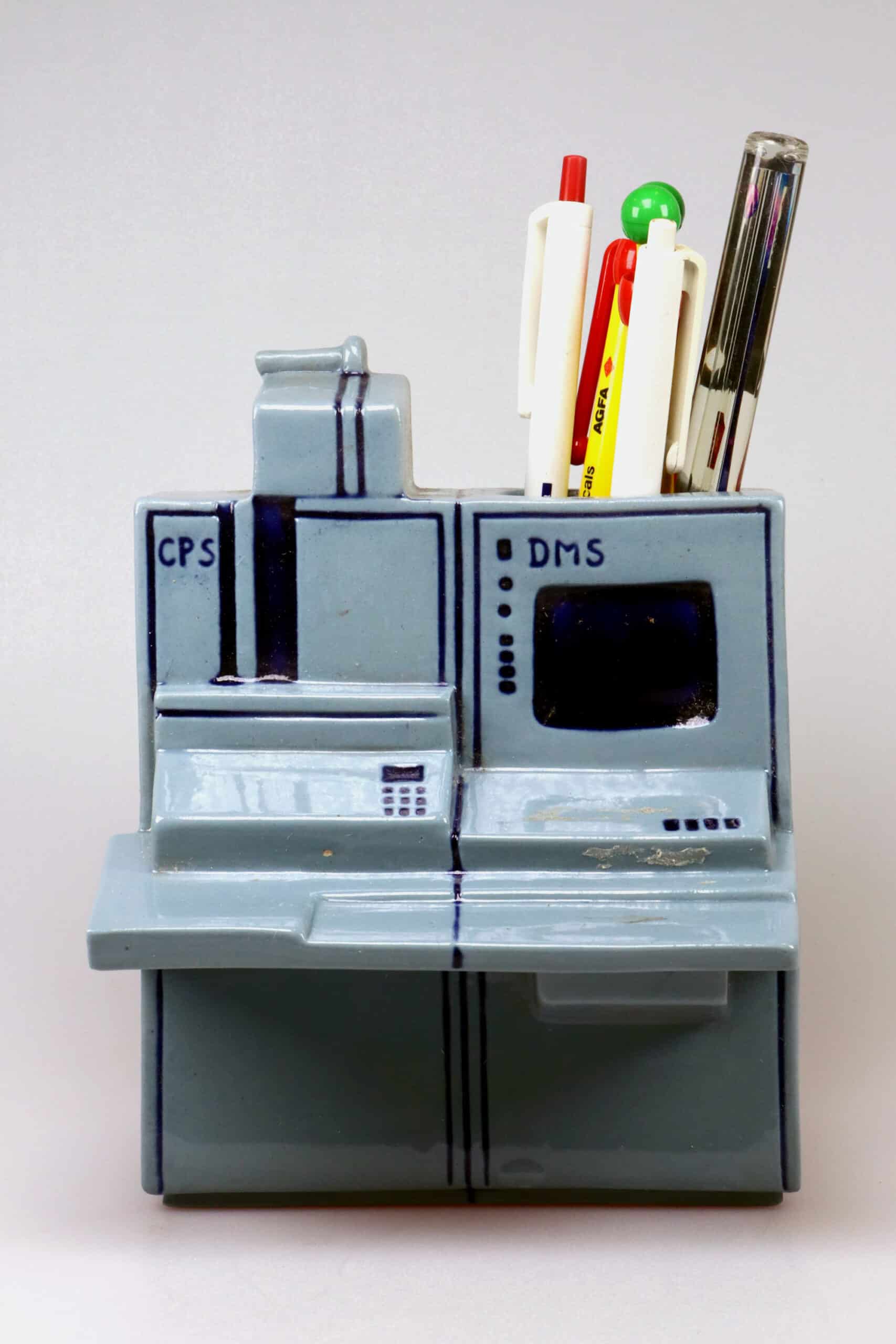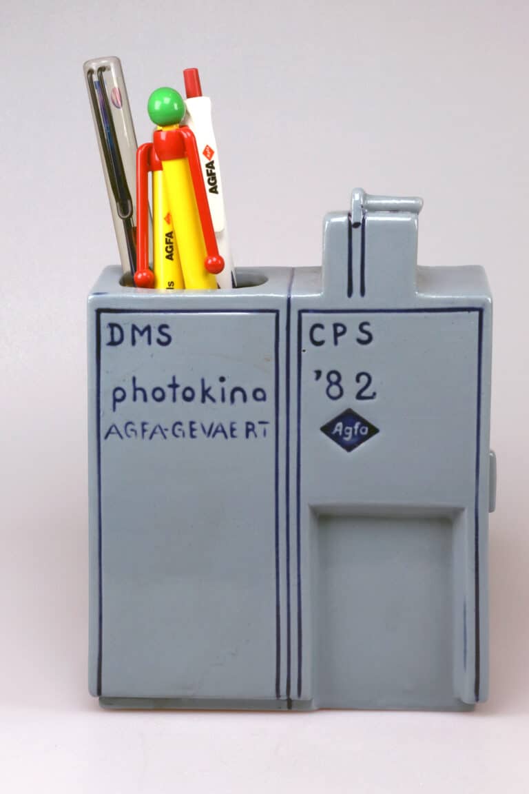 Dieser Stiftehalter aus Keramik wurde von Agfa-Gevaert auf der Kölner Photokina 1982 unters Volk gebracht. Er symbolisiert eine Agfa-Computerstation, die zur Vorbereitung der Aufträge in Kopieranstalten diente.