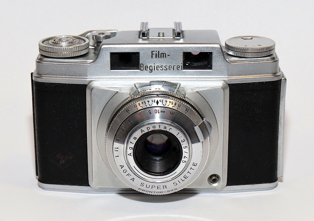 Agfa Super Siletten gibt es wie Sand am Meer, diese hier ist eine besondere: Sie stammt aus einer Agfa-Filmfabrik und wurde ausweislich der eingravierten Beschriftung zwischen den Sucherfenstern als Betriebskamera in einer „Filmbegießerei“ eingesetzt, vermutlich, um die Produkte zu testen.