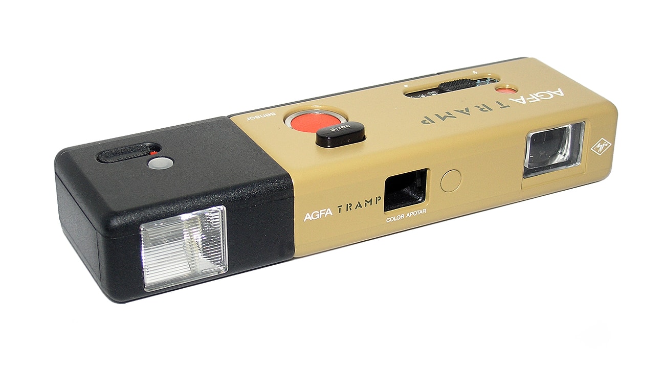 Eine Variante der Pocketkamera Agfamatic 901 S: die Tramp (1982), hier mit angestecktem Agfa-Elektronenblitzgerät. Sucherkamera für den Kassettenfilm 110 (Aufnahmeformat 13 x 17 mm). Objektiv: Color Apotar 1:6,3/27 mm, Fixfokus. Leuchtrahmensucher. Einfachverschluss. Manuelle Belichtungssteuerung. Eingebauter Winder und Serienbildfunktion.
