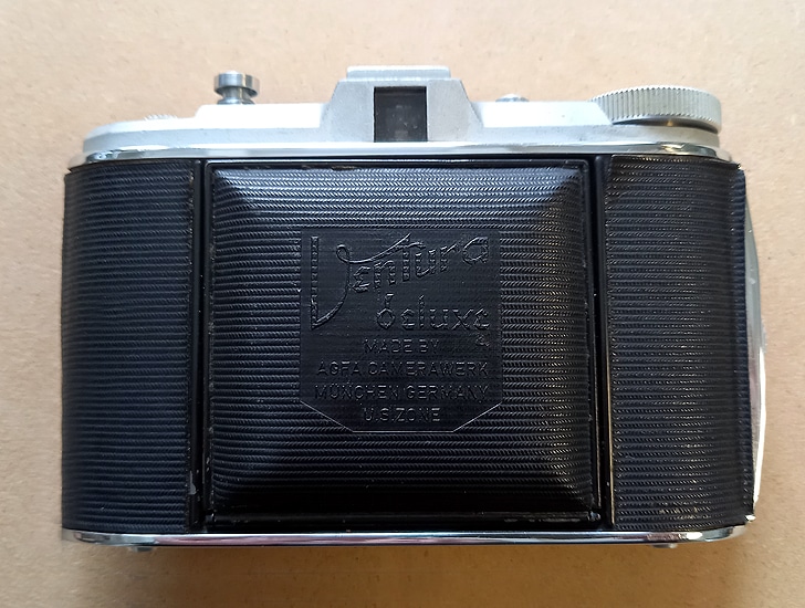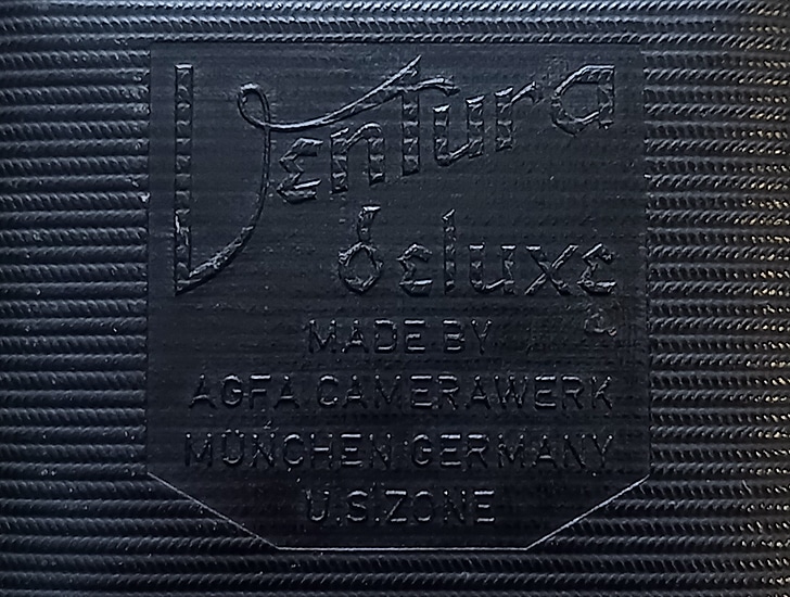 Agfa Ventura deluxe: Die Isolette II für den Export unter anderem Namen. Objektiv: Agfa Apotar 1:4,5/8,5 cm, Nr.: 2786, Entfernungsangaben in „Feet“; Newton-/Fernrohrsucher. Verschluss: Prontor-S (mit Vorlaufwerk und Synchronanschluss für Blitzgerät). Langzeitbelichtungen sind möglich durch die Verschlusseinstellung „B“ und Arretierung des Auslösers durch einen Schieber. Balgen aus Kunststoff. Der Name „Ventura deluxe“ erscheint auf der Prägung der Frontklappe mit der Angabe „Made by Agfa Camerawerk München Germany U.S. Zone“. In der Exportversion für die USA hieß diese Abart der Isolette II dann „Ventura 66 Deluxe“.