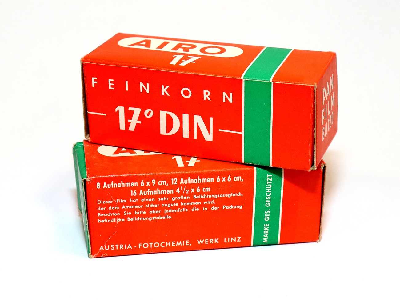 Ein besonderes „Schmankerl“: ein österreichischer SW-Rollfilm 120 namens Airo 17. Ein 17-DIN-Feinkornfilm von „Austria-Fotochemie, Werk Linz“ (Ablaufdatum: Dezember 1973). Laut Garantieschein konnte man ihn sogar bis 25 DIN pushen.