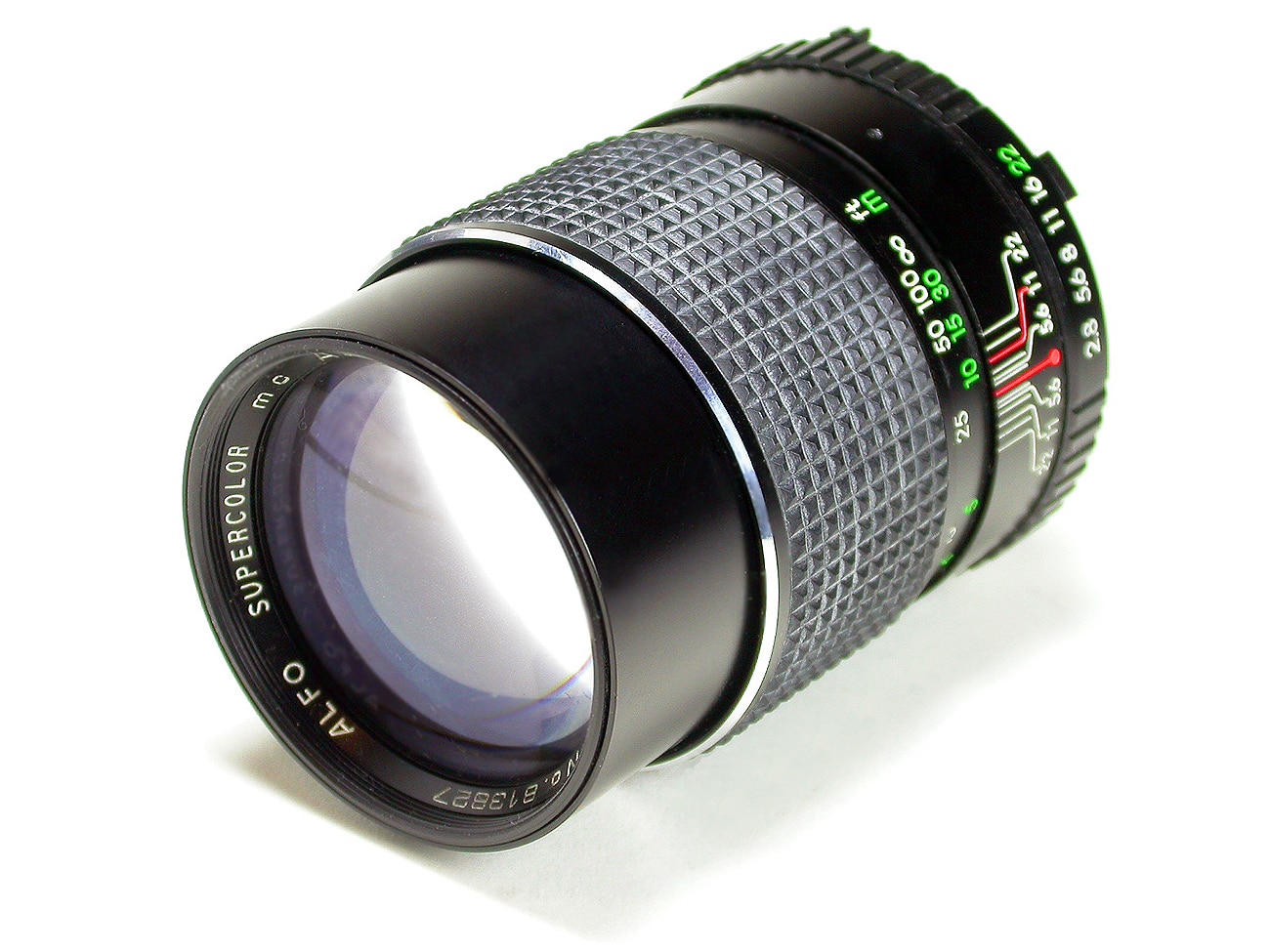Ein einfaches Tele der deutschen Handelsmarke Alfo: 1:2,8/135 mm. Kürzeste Entfernungseinstellung: 1,5 Meter; 1970er/1980er Jahre. Objektivanschluss mit Minolta-MC-Bajonett.