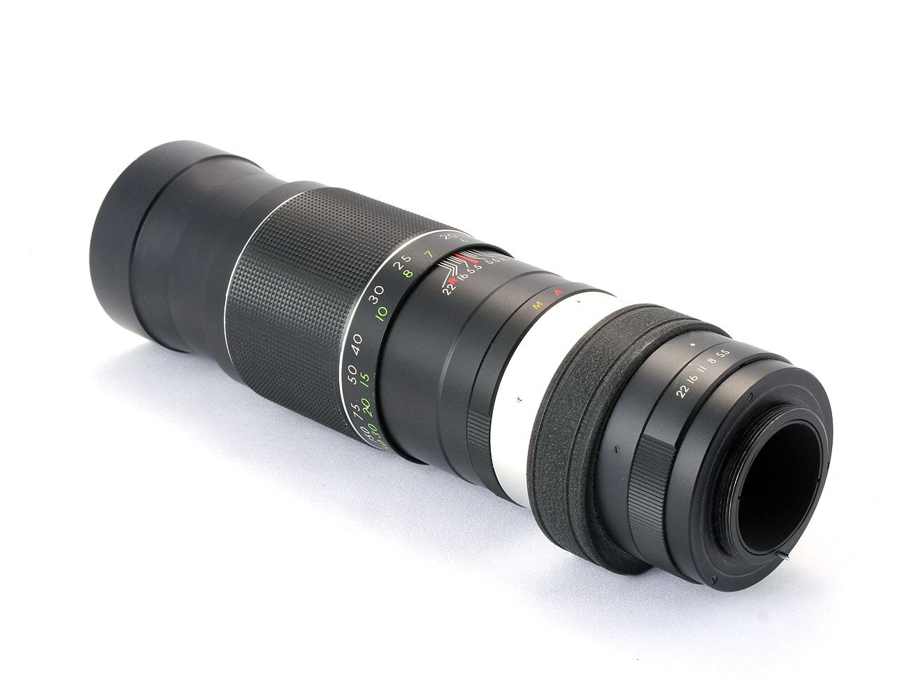 Teleobjektiv M 42, Festbrennweite: Aremac (Japan) 1:5,5/300 mm. Kürzeste Einstellentfernung: 3,70 Meter. Mit Stativschelle.