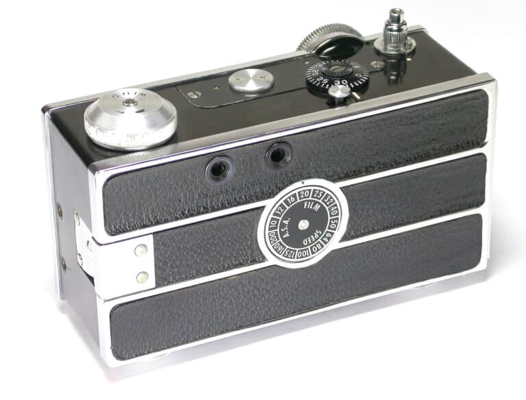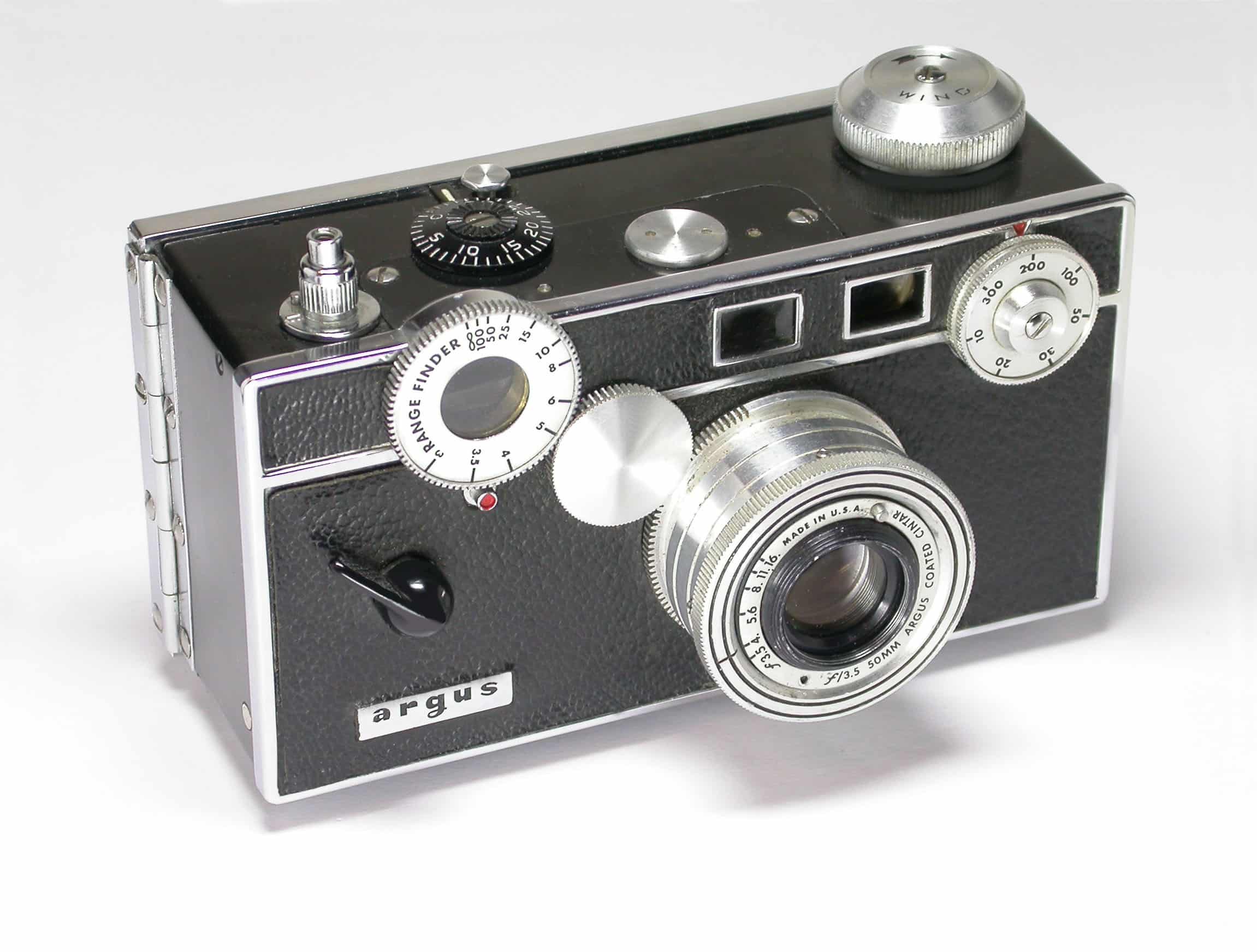 Eine massive Kleinbild-Kamera aus den USA von der Firma Argus Inc., Ann Arbor. Das dürfte eine Argus C3 sein, Baujahre 1939 bis 1957 (Erkennungszeichen: Gekuppelter Entfernungsmesser, Bildzählwerk schwarz, kein Zubehörschuh, Namensschild vorne). Verschluss: Argus bis 1/10 bis 1/300 Sekunde. Das Museumsexemplar besitzt ein Objektiv Argus Cintar 1:3,5/50 mm.
