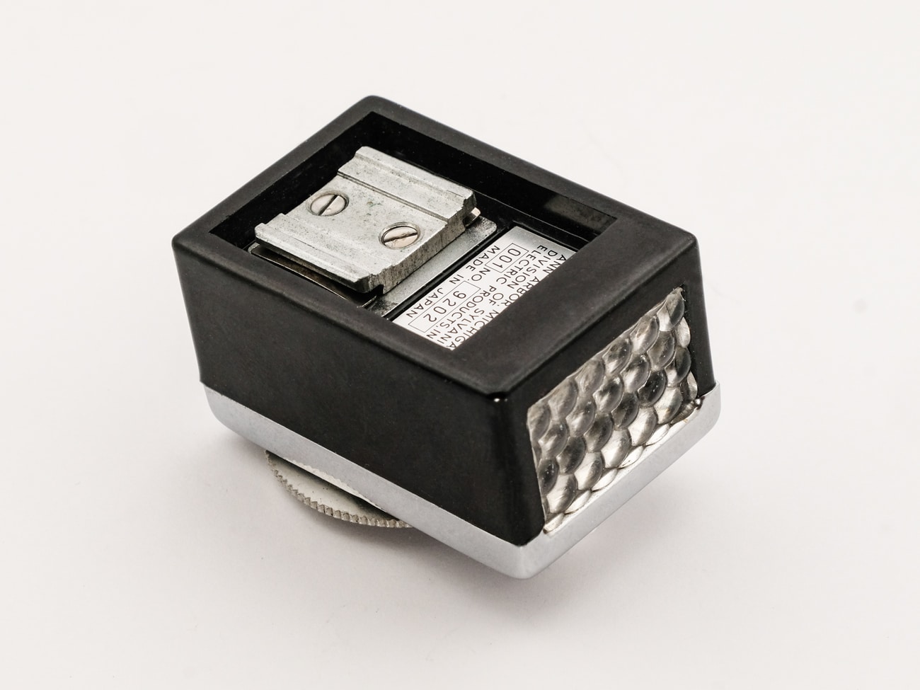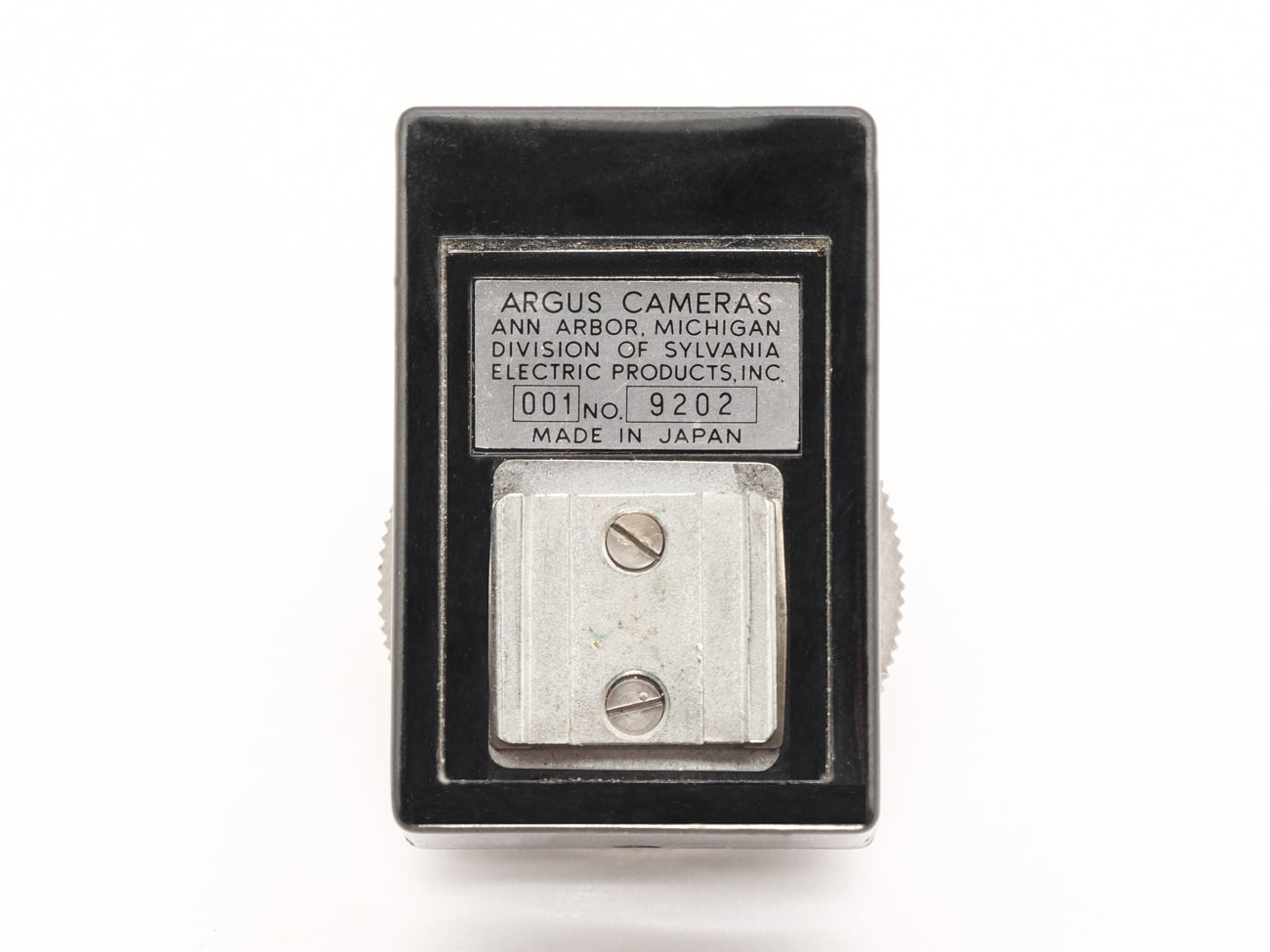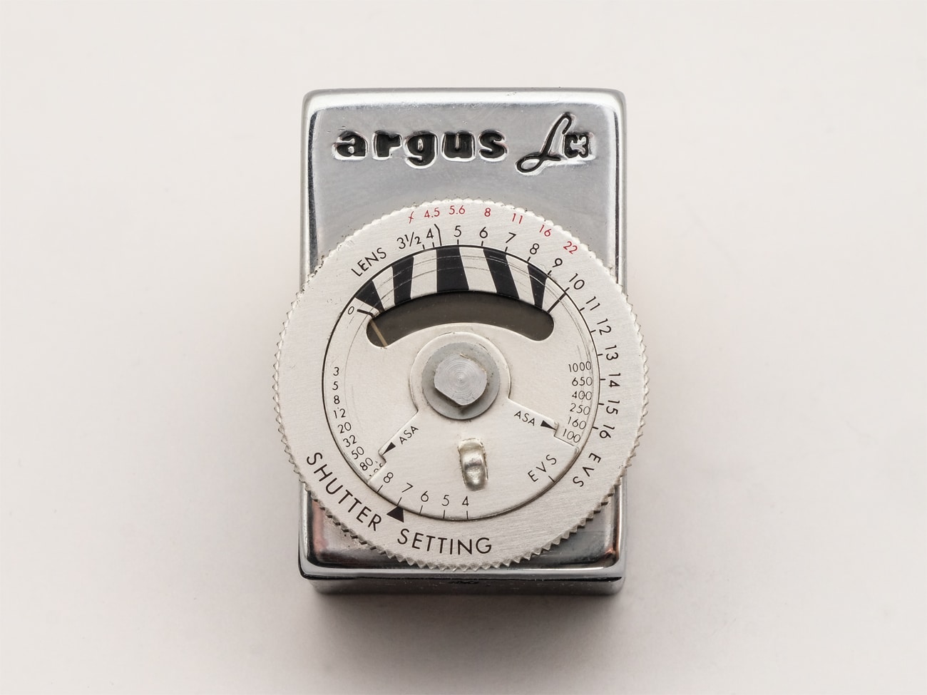 Aufsteckbarer Selenbelichtungsmesser von Argus Cameras, Ann Arbor, Michigan, Division of Sylvania Electric Products Inc., produziert in Japan Ende der 1950er Jahre, passend zur Argus C 3 Matchmatic. Die Bedienoberfläche weist einige Besonderheiten auf: Anstelle einer Zeitskala ist hier eine fünfteilige „Shutter Setting“-Skala vorhanden, die mit der Kamera korrespondiert. Die Werte 4 bis 8 entsprechen 1/10 bis 1/300 Sekunde. Die Empfindlichkeitsskala ist sehr eng gestaffelt; um die Ablesbarkeit zu erleichtern sind zwei ASA-Indexmarken und zwei Teilskalen vorhanden, die abwechselnd zu lesen sind. Für die Messung wird zunächst der Zeitwert, z. B. 7, per Drehscheibe eingestellt und dann der dem Messzeiger gegenüberliegende EVS-Wert auf die Kamera übertragen. Die Selenzelle erzeugt, abhängig von der Helligkeit, einen elektrischen Strom, der zur Ansteuerung des Zeigerinstruments verwendet wird, eine zusätzliche Stromquelle ist nicht erforderlich. Die Skalenwerte: Empfindlichkeit ASA 2,5 bis 1.250, Lichtwerte EVS 3,5 bis 16.