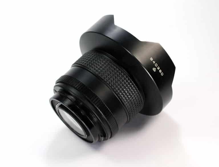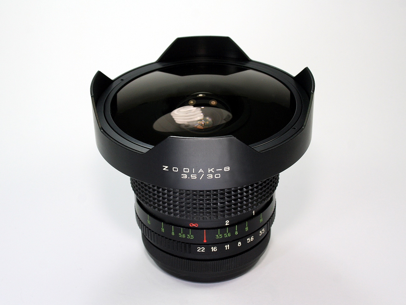 Sowjetisches Fischauge-Objektiv 1:3,5/30 mm aus den 1980er Jahren von Arsenal Kiew für die Pentacon Six, Praktisix Kiev 60 oder andere Kameras mit diesem Bajonettanschluss. Das Objektiv hat zehn Linsen in sechs Gruppen, der Bildwinkel beträgt 180 Grad, es wiegt etwa 980 Gramm. Es hat eine automatische Blendensteuerung, die kleinste Blende ist 22, die Fokussierung erfolgt manuell. Die kürzeste Entfernungseinstellung: 30 Zentimeter.