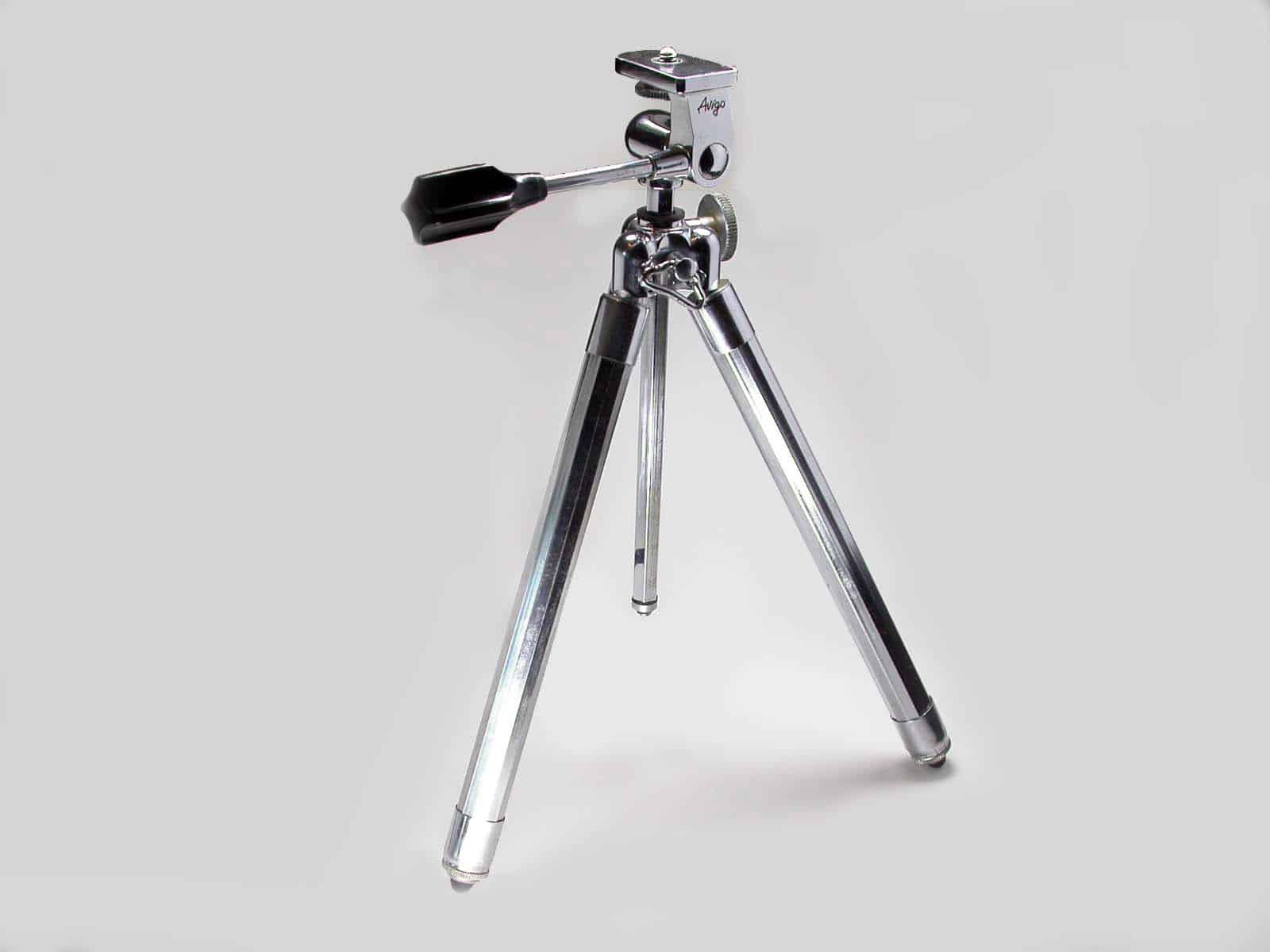 Damals sicher sehr teuer, dieses hochwertige, mehrfach ausziehbare Metallstativ namens Avigo für Filmer und Fotografen (hier alle Beine eingeschoben); vermutlich 1950er/1960er Jahre. Kino-Neigekopf und mittels Zahnradtrieb höhenverstellbare Mittelsäule. Dazu: Ledertasche mit Reißverschluss.