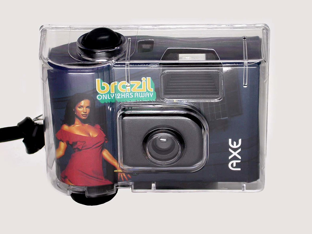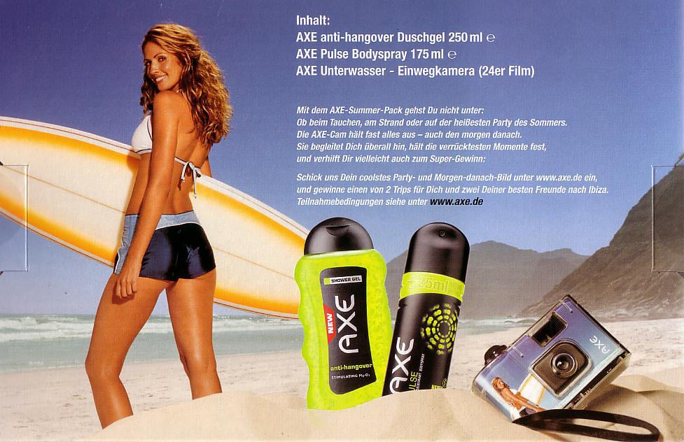 Ein Set mit AXE Pulse Bodyspray (175 ml), AXE Anti-Hangover Duschgel (250 ml) und einer „AXE-Cam“, einer einfachen Einweg-Unterwasserkamera (dicht bis drei Meter Tiefe) mit einem 200er Kleinbild-Farbfilm für 24 Aufnahmen. Das Ganze laut Packungsaufdruck „hochentzündlich“ – nicht nur wegen der heißen Lady. Filmhaltbarkeit bis mindestens März 2005. Dieses Set gab es in weiteren Versionen.