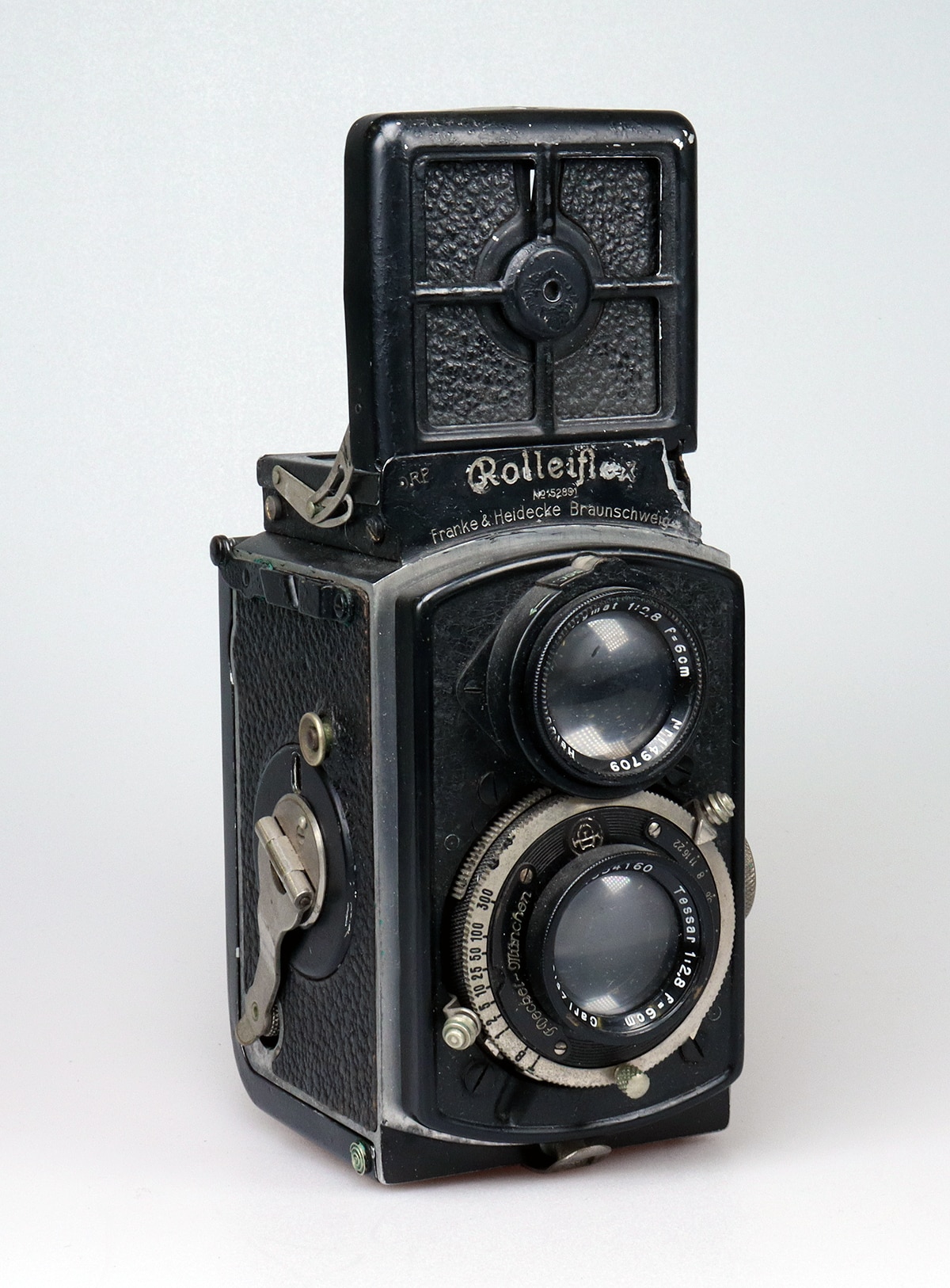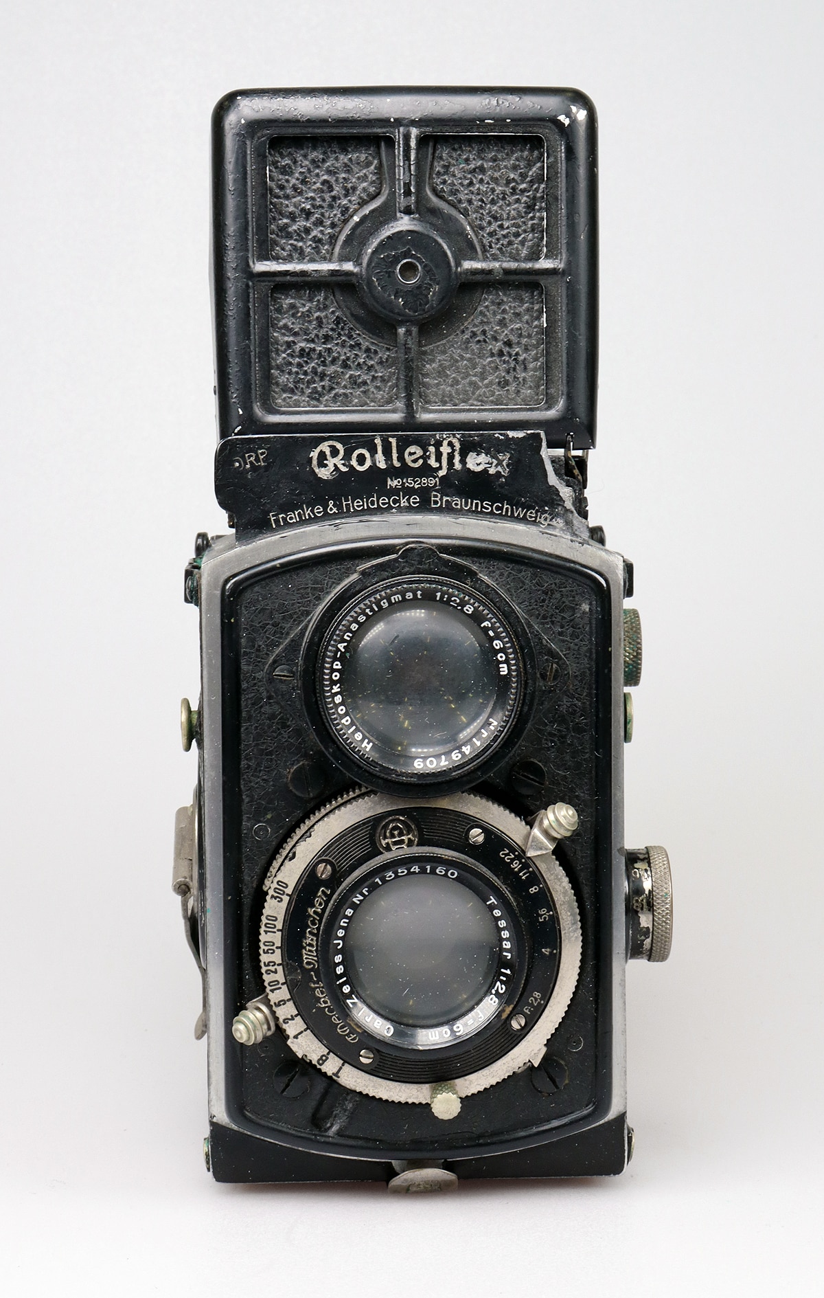 Zweiäugige Spiegelreflexkamera für den Rollfilm 127 (Negativformt 4 x 4 cm). Objektive: hier mit Carl Zeiss Jena Tessar 1:2,8/6 cm, Nr. 1354160 (Aufnahme), Heidoskop-Anastigmat 1:2,8/6 cm, Nr. 149709 (Sucher). Reflexsucher mit Lichtschacht. Verschluss: hier ein Compur (bis 1/300 Sekunde) von Friedrich Deckel, München, Nr. 2472301. Es gab auch ein Tessar mit Lichtstärke 1:3,5.
