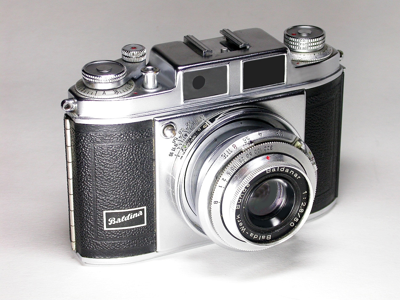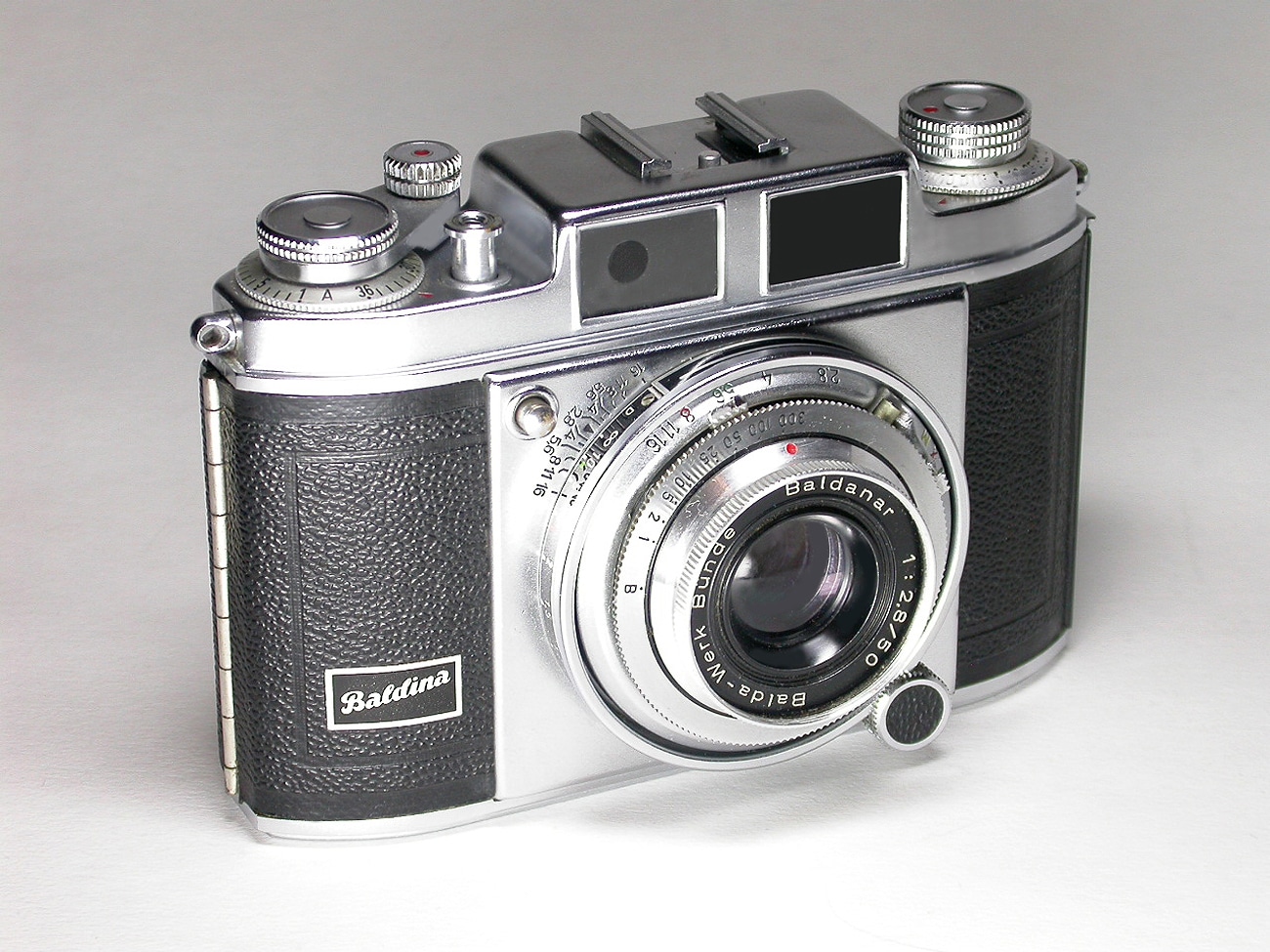 Eine hübsche Hochstapler-Sucherkamera, hergestellt ab 1954, für den Kleinbildfilm 135 (Aufnahmeformat 24 x 36 mm). Hersteller: Balda-Werk, Bünde. Objektiv: Baldanar 1:2,8/50 mm. Verschluss: Prontor-SVS (B, 1 bis 1/300 Sekunde; Vorlaufwerk). Zubehörschuh, Blitzsynchronkontakt, Filmmerkscheibe. Filmtransport und Verschlussaufzug sind bereits gekuppelt. Hier mit ausgefahrenem Springtubus.